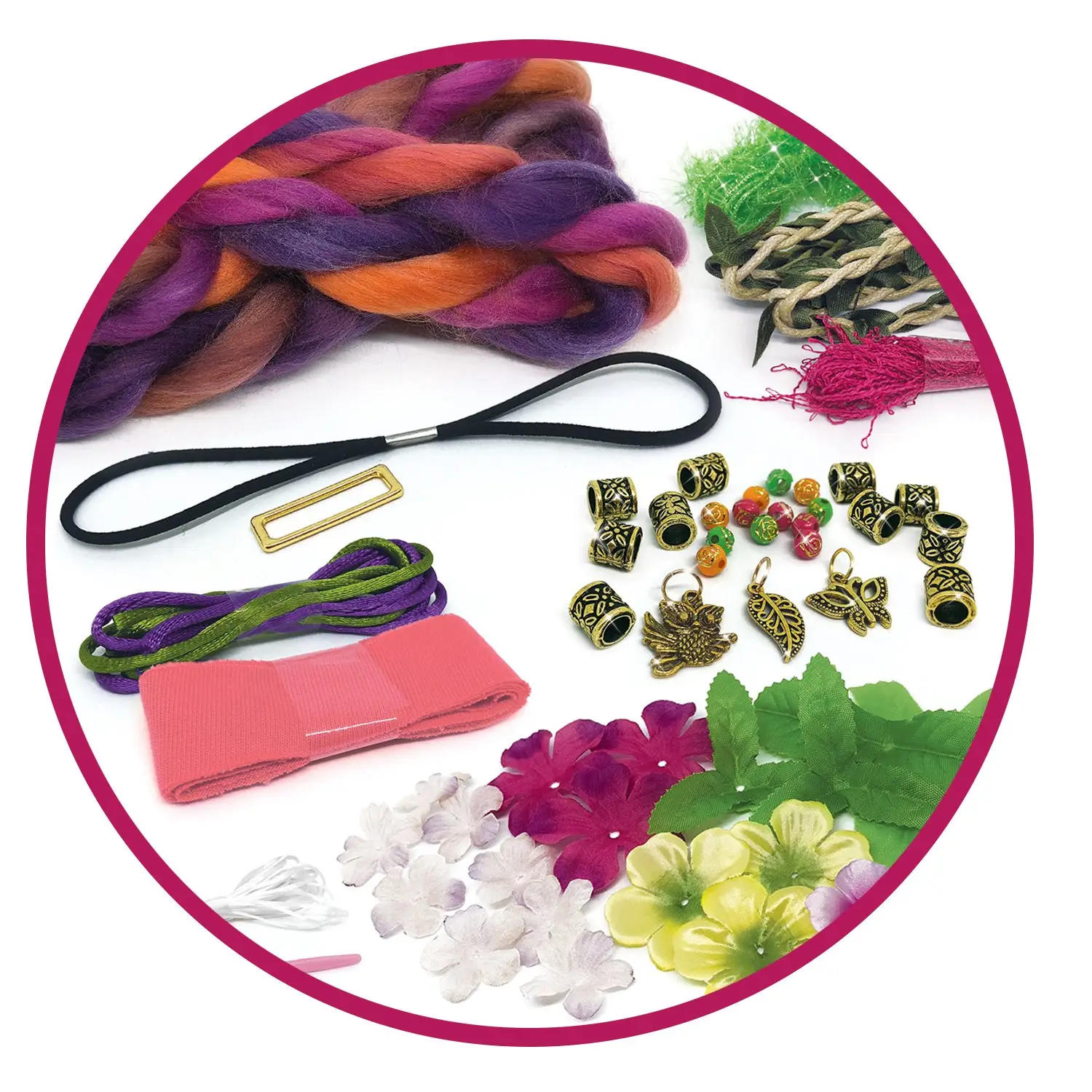 В комплекте: цветное волокно, декоративные нити, шнурок, веревочки, лента, пластиковая игла, резинка, бусины, аксессуары.