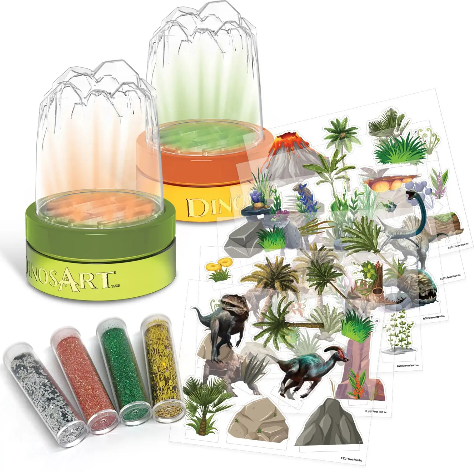 Набор от Nebulous Stars для творчества по воссозданию среды обитания динозавров в формате мини-аквариумов с подсветкой, выполняющих функцию ночных светильников.