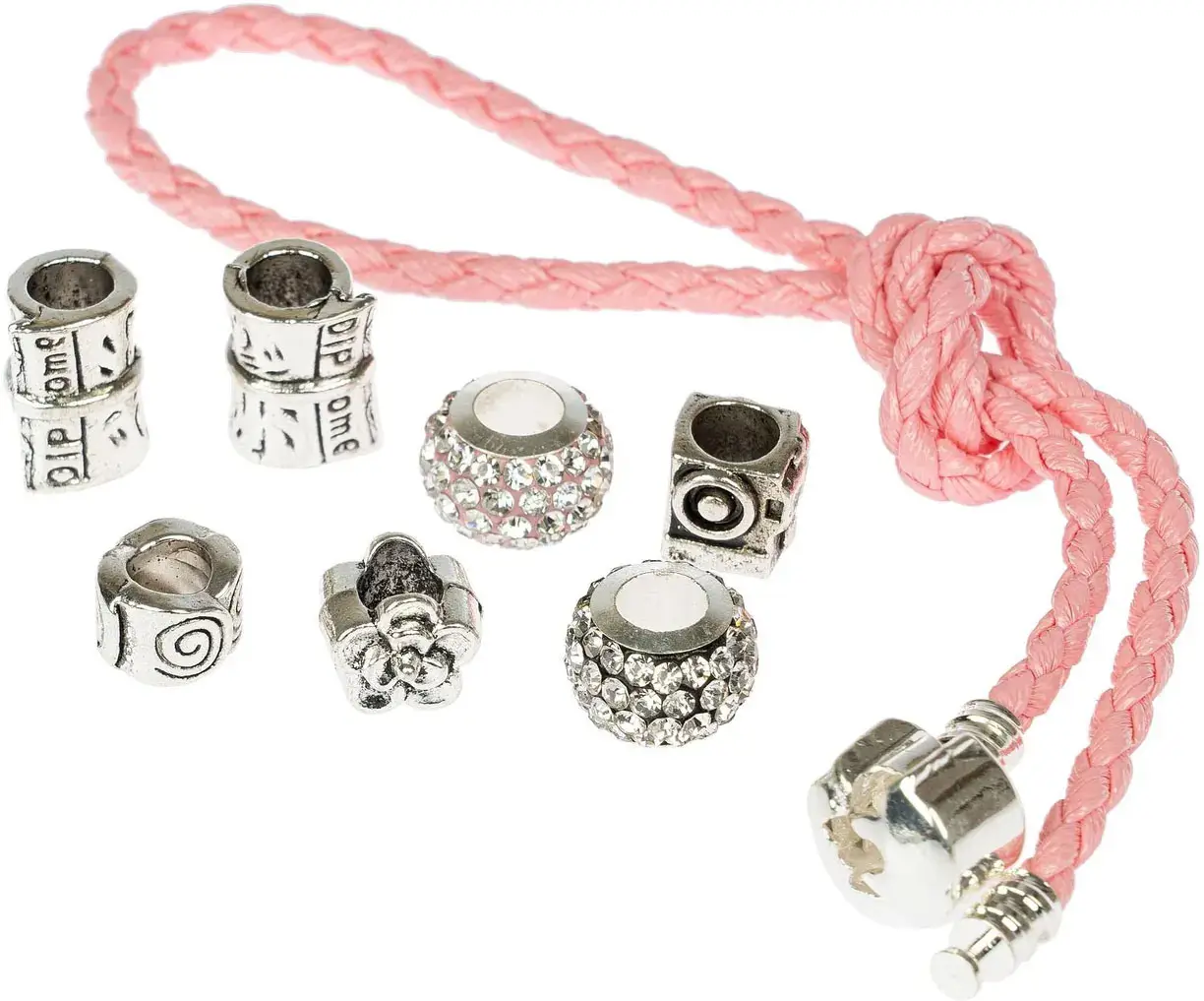 В комплект входит: 1 розовый браслет с замком, 9 шармов, инструкция.