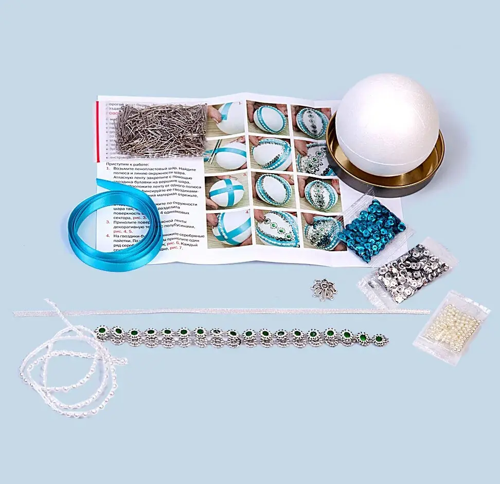 Вместе с набором для творчества от российской компании «Волшебная мастерская» можно создать оригинальное новогоднее украшение для ёлки. Набор представлен заготовкой овальной формы, выполненной из лёгкого пенопласта и разнообразными материалами для её декорирования. В процессе сборки у ребёнка развивается мелкая моторика, практические навыки.