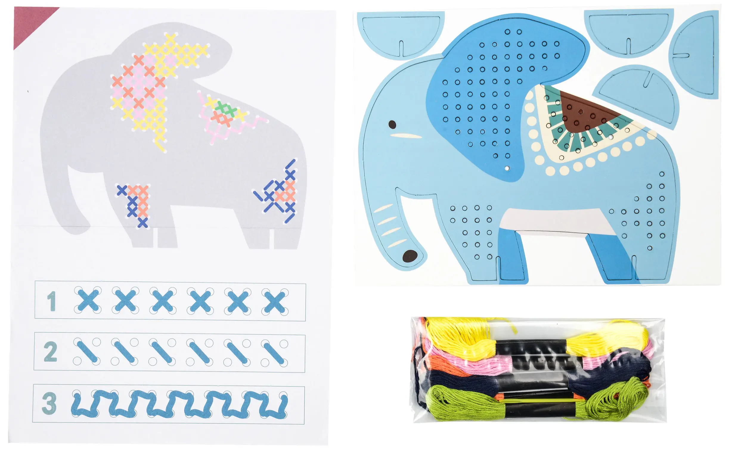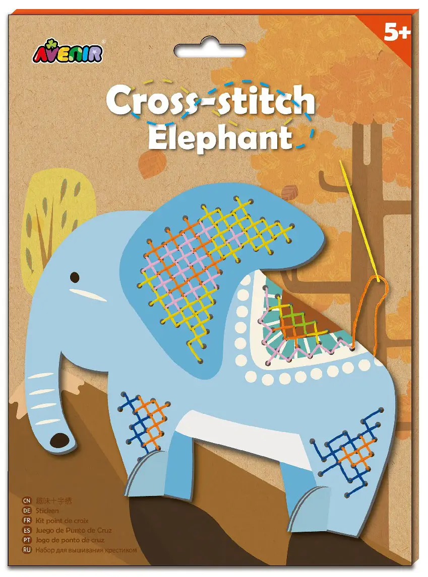 Для этого достаточно лишь следовать простой иллюстрированной инструкции, которая учит разным методам вышивки. Предварительно пробитые части картонной заготовки позволяют с лёгкостью освоить технику вышивки. Готовая фигурка слона для удобства игры устанавливается на подставки.