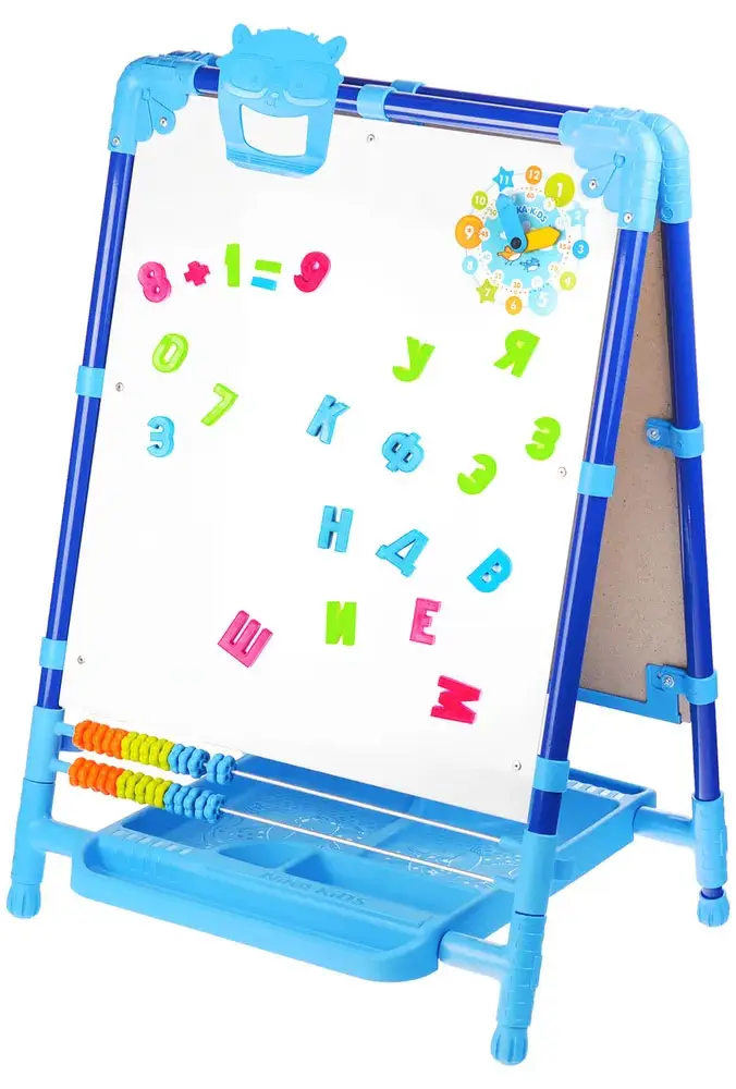 Двухсторонний мольберт с регулируемой высотой, на котором можно рисовать маркерами и мелом. Также он оснащен магнитной доской для использования магнитов, счётами и пеналом для канцелярских принадлежностей. Дополнительно с мольбертом идет набор для творчества, упакованный в мешочек из ткани. Конструкция позволяет менять положение поверхности рисования по высоте в соответствии с ростом ребёнка.