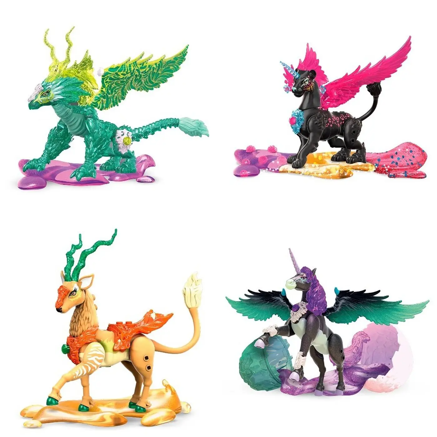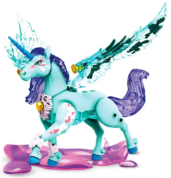 - внутри яйца, открывающегося на 2 части, ребенка ожидают детали для сборки хрустальных существ с волшебной внешностью (в том числе очарованных единорогов) и слизь;
