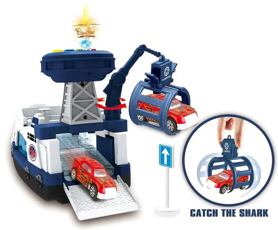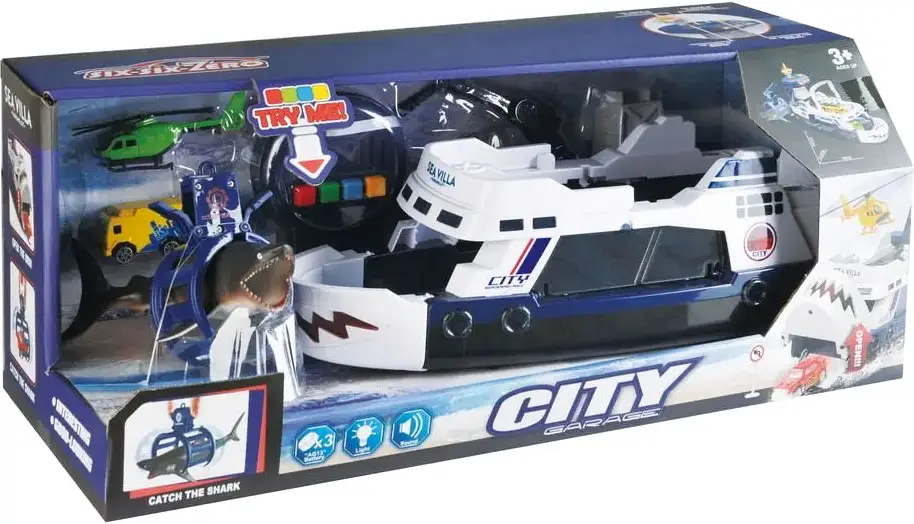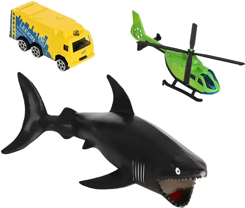 - в наборе – корабль, машинка (модели в ассортименте), вертолет, фигурка акулы;