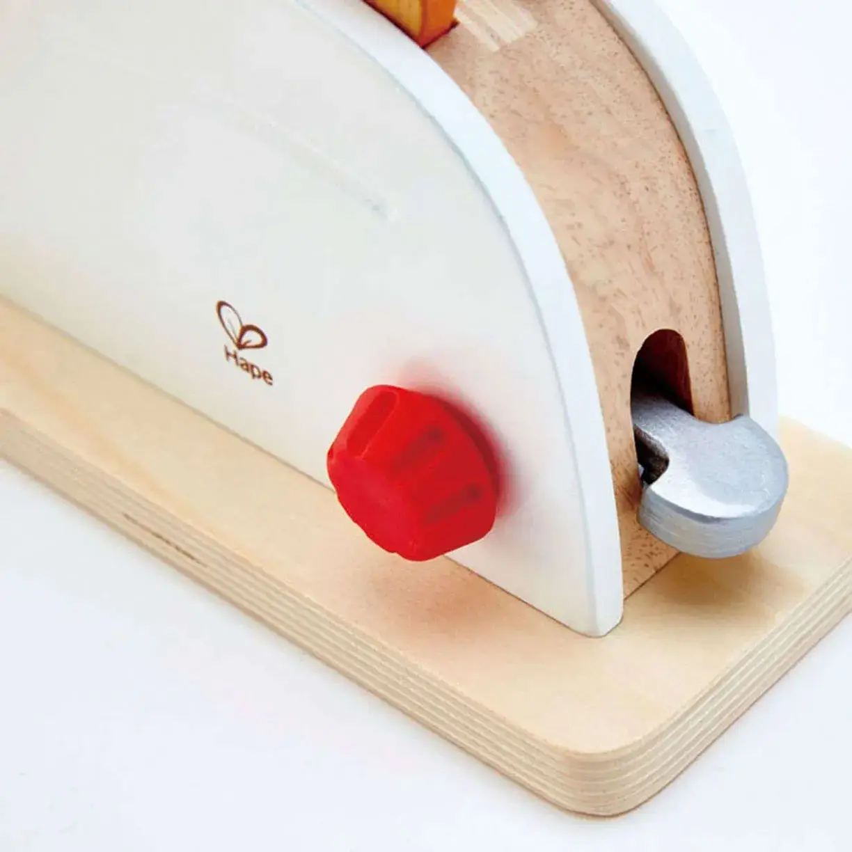 Игрушка от бренда Hape характеризуется высокой детализацией элементов. На корпусе тостера есть кнопка активации и выключения, а также отделение для ломтиков хлеба.