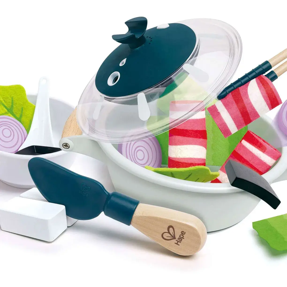 Игровой набор в горшочке от Hape развивает зрительно-моторную координацию и мелкую моторику. Идеально подходит для развития воображения и обмена информацией, а также языковых и социальных навыков. Включает в себя одну кастрюлю с крышкой, одну ложку, один нож, два листа салата, одну луковицу, один кусок тофу, три говяжьих рулета, одну пару палочек для еды, три кусочка нарезанной капусты, два кусочка морских водорослей и одну маленькую миску.