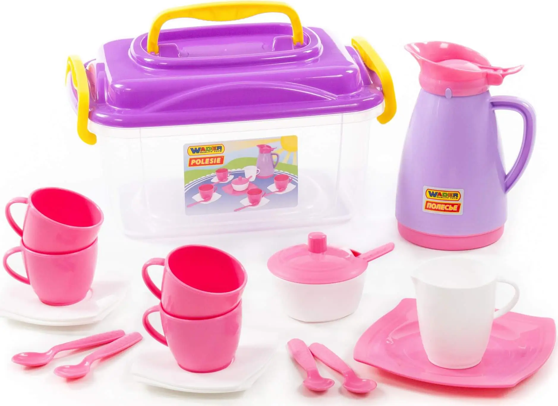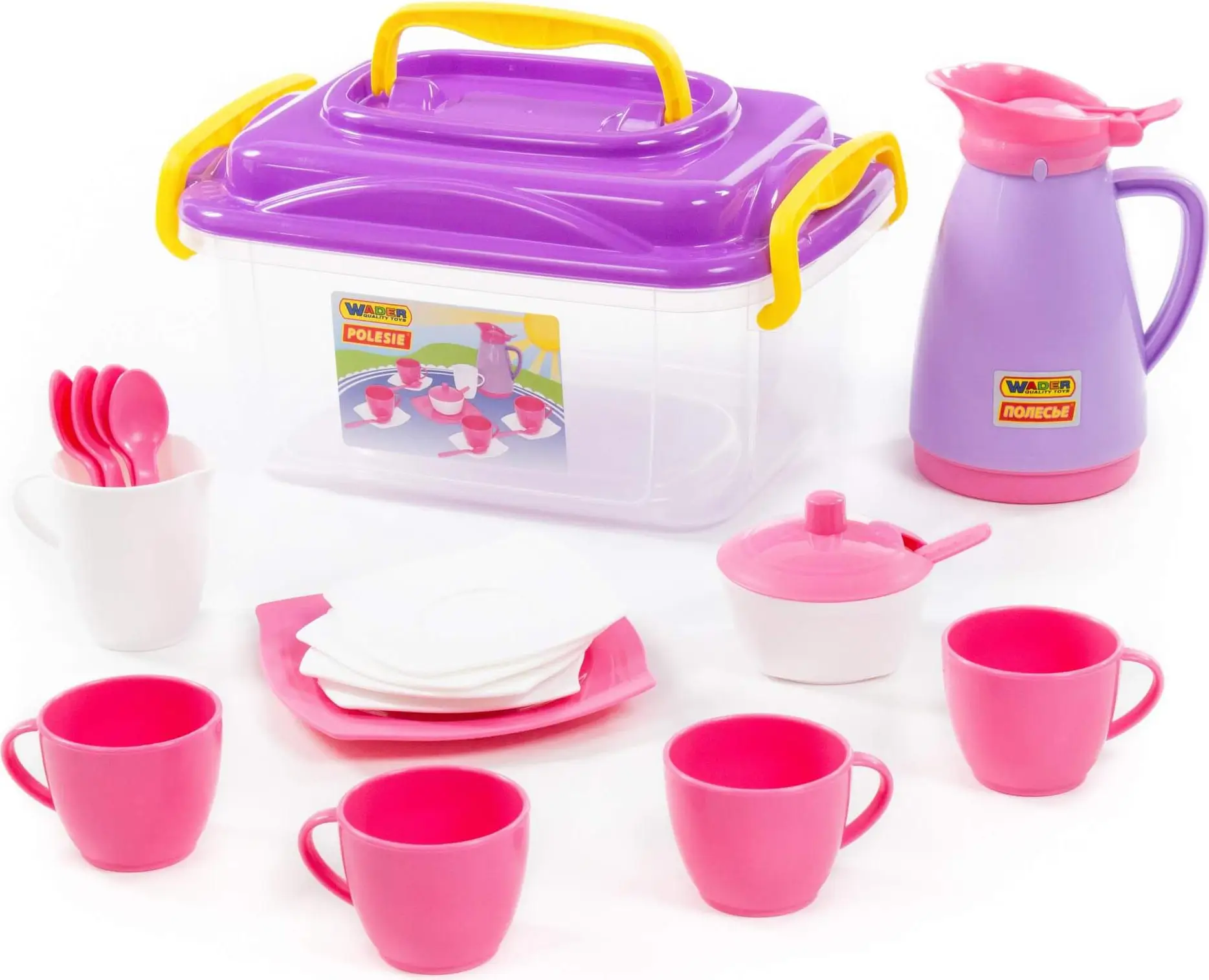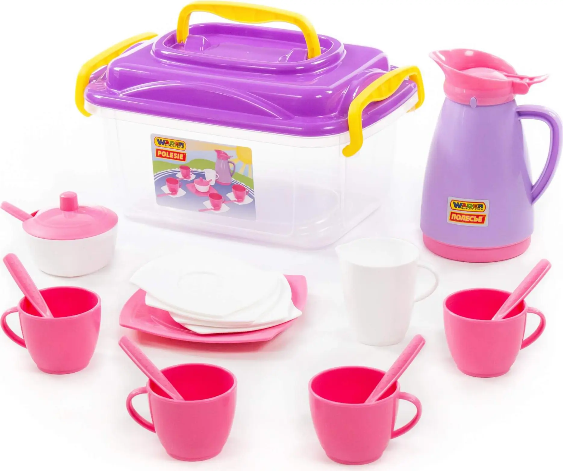 Игрушечный набор посуды Алиса от Полесье – милый игровой набор для организации весёлого кукольного чаепития. В комплект входят 17 принадлежностей, чтобы организовать кукольное чаепитие: кофейник, сахарница, чашки, блюдца, ложки и сливочница.