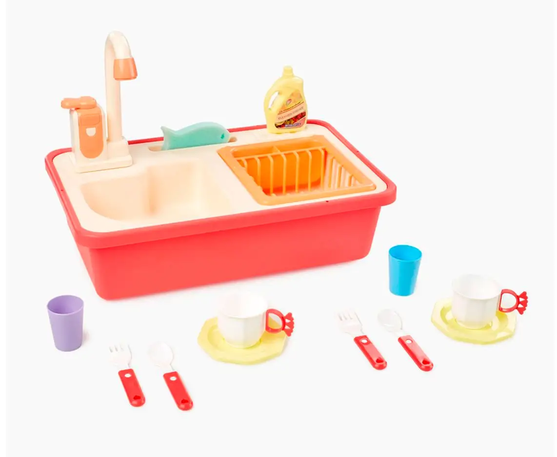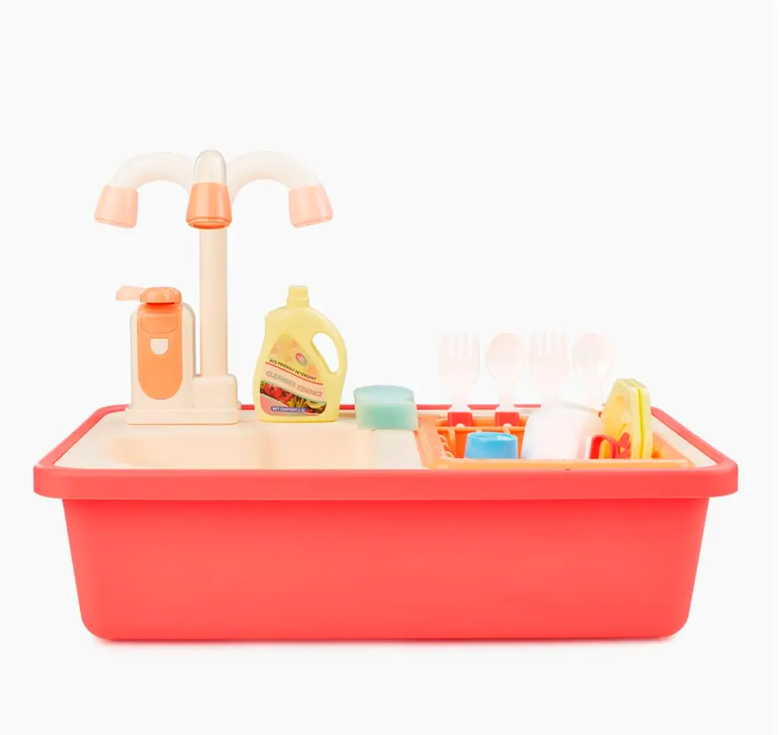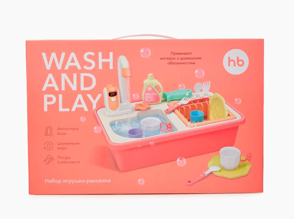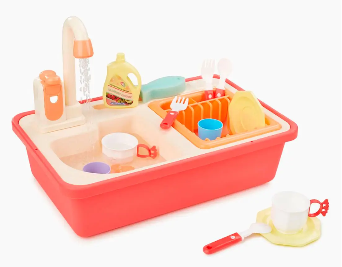 Игрушечная мойка даст возможность плескаться в воде, представлять себя взрослым и не терять интерес к домашним делам. Вода в игрушке циркулирует. Наполните мойку водой, включите кран – вода начнёт вытекать через него обратно в мойку, а затем снова попадёт в кран. Играть можно бесконечно. Приятные эмоции обеспечены.