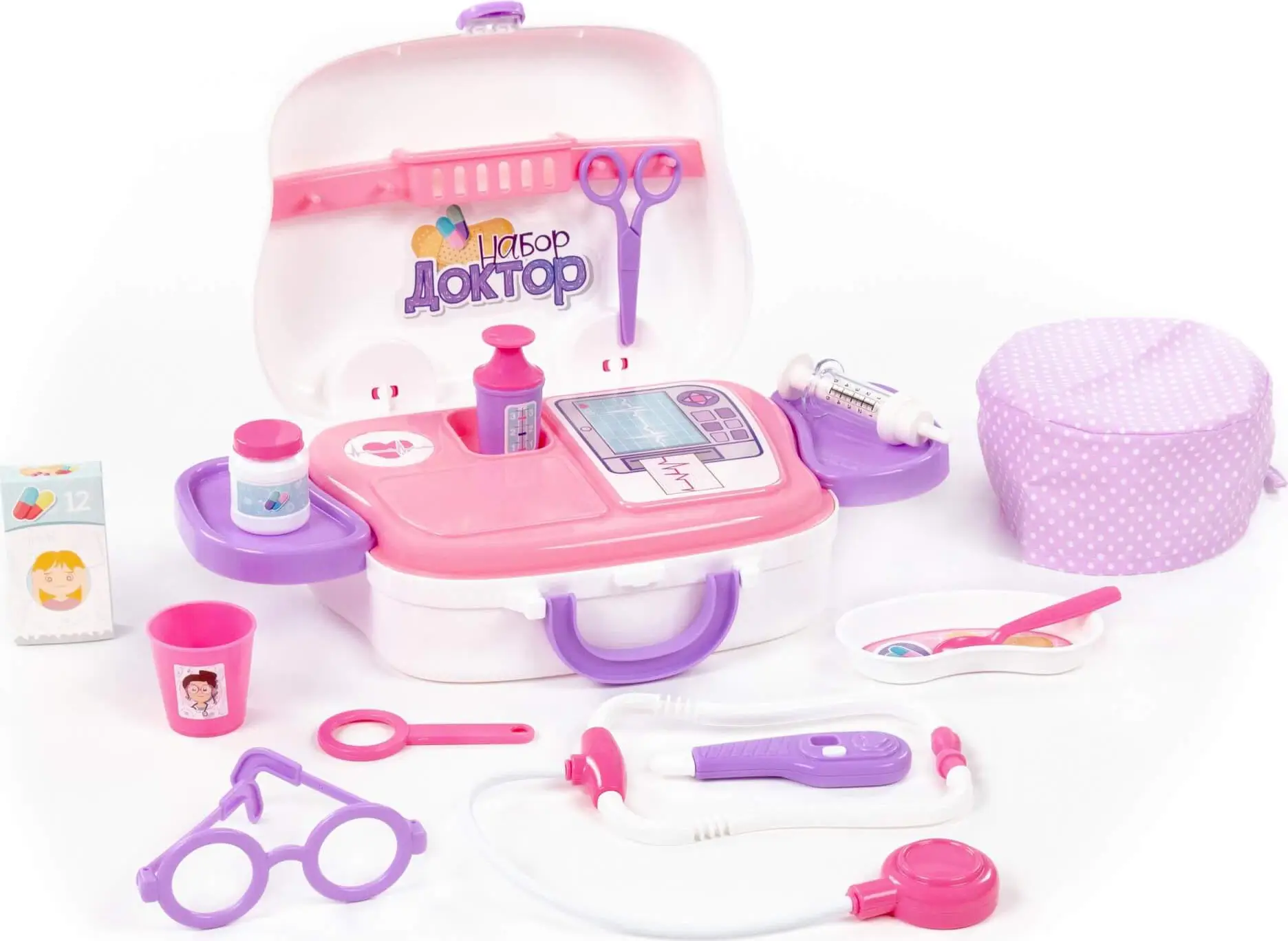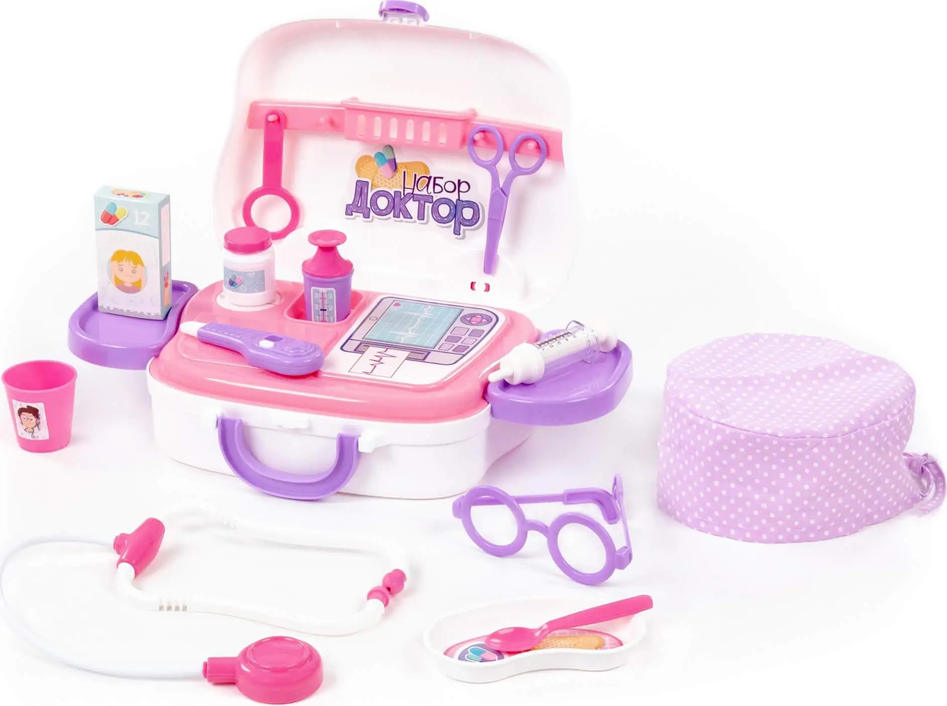 Игровой набор Доктор Кот от фабрики Полесье представлен медицинских инструментов в чемоданчике.