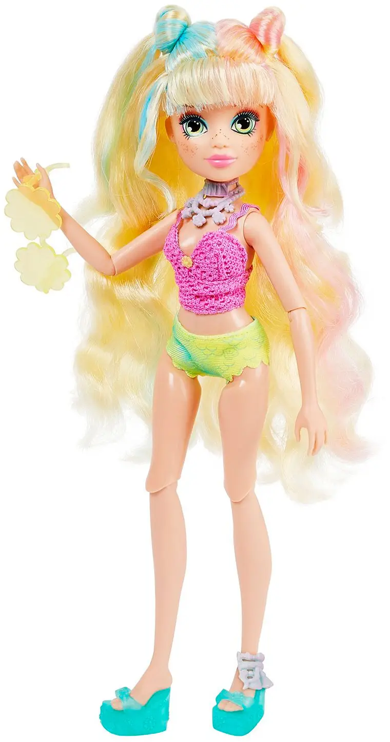 Кукла Финли с подвижными ручками и ножками со съемным хвостом из ткани премиум-класса и купальником, аксессуарами и волосами, способными частично менять цвет на солнце. Съёмный хвост русалки Финли в нежных цветах и кружеве отражает романтичный характер девушки. Сними хвост русалки и переодень Финли в стильный купальник для приключений на суше. Подставь Финли под лучи солнца и увидишь, как пряди ее волос меняют цвет с сине-розового на пурпурный. Придавай кукле различные позы, придумывай и разыгрывай свои собственные сюжеты. Базовые куклы русалки не предназначены для игр в воде!