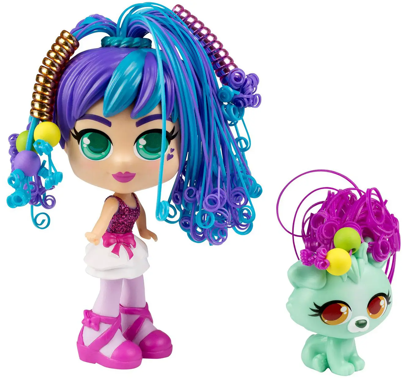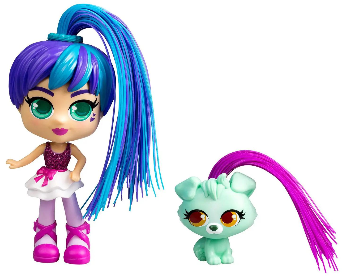 Очаровательная куколка балерина Росли с фиолетовыми волосами в красивом балетном платье и ее питомец щенок Коди готовы сделать новые прически.