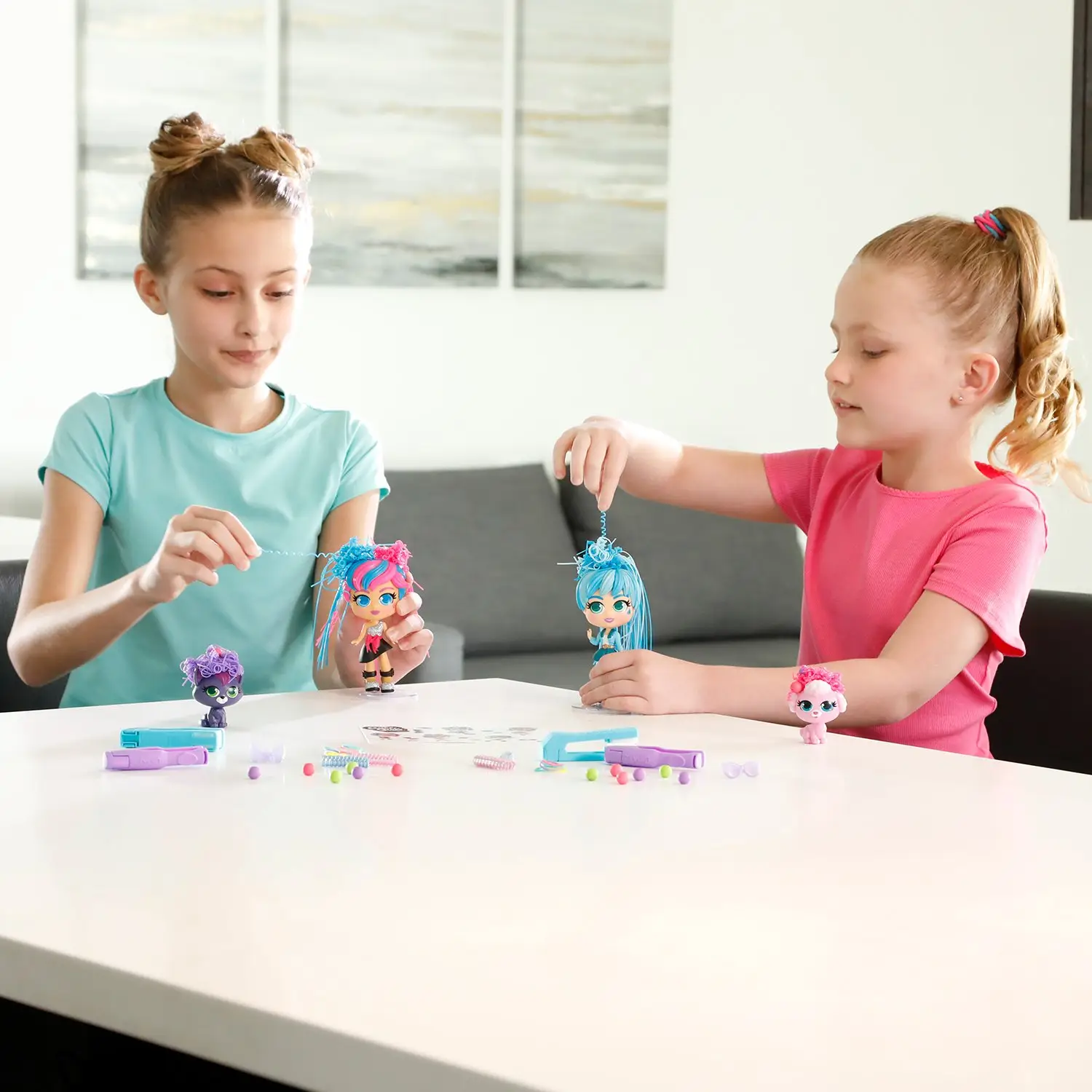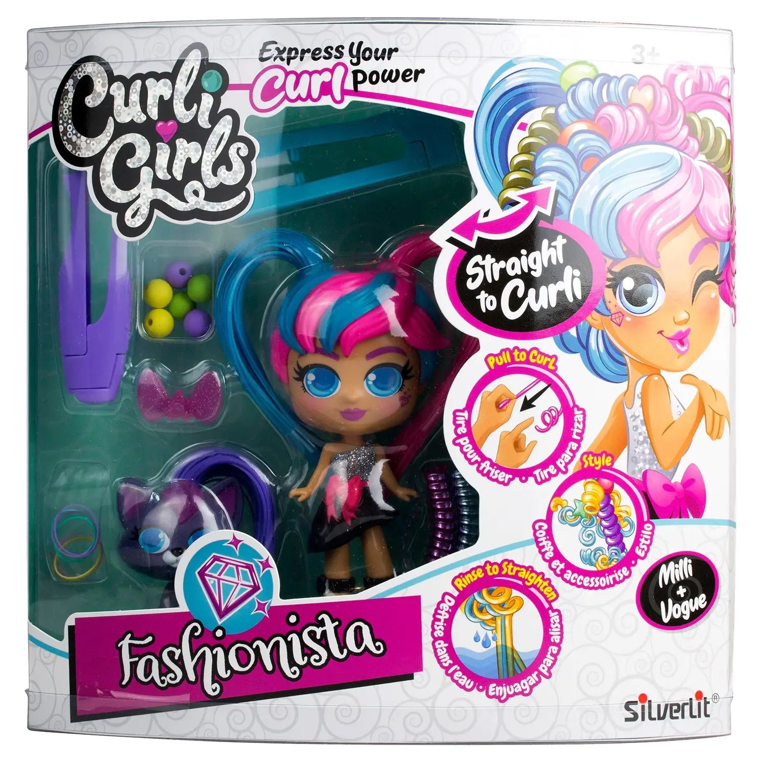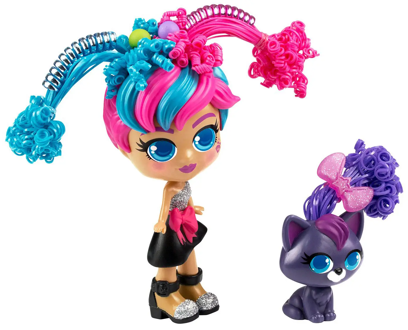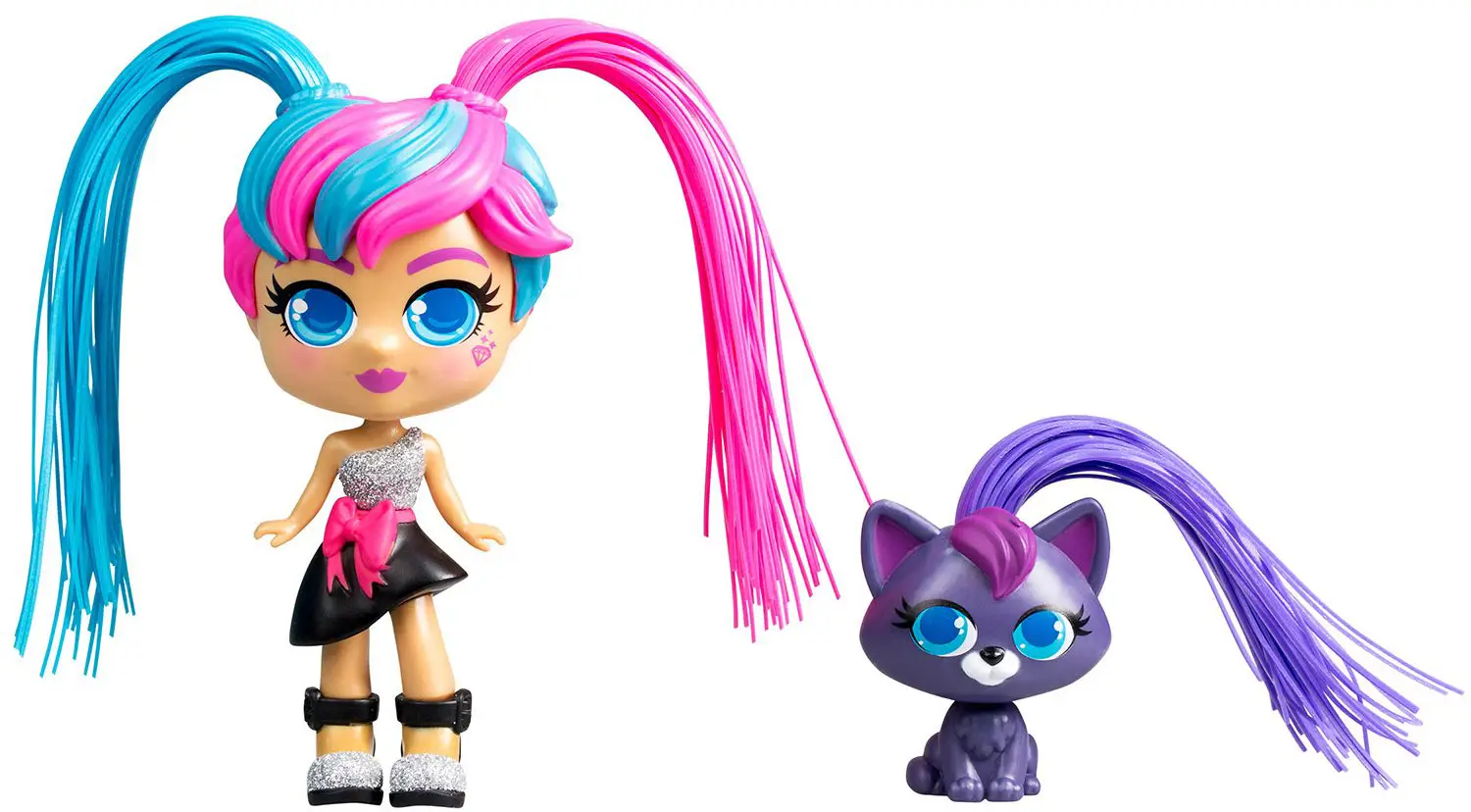 Очаровательная куколка модница Милли с розово-синими волосами в красивом праздничном платье и её питомец котёнок Вог готовы сделать новые причёски.