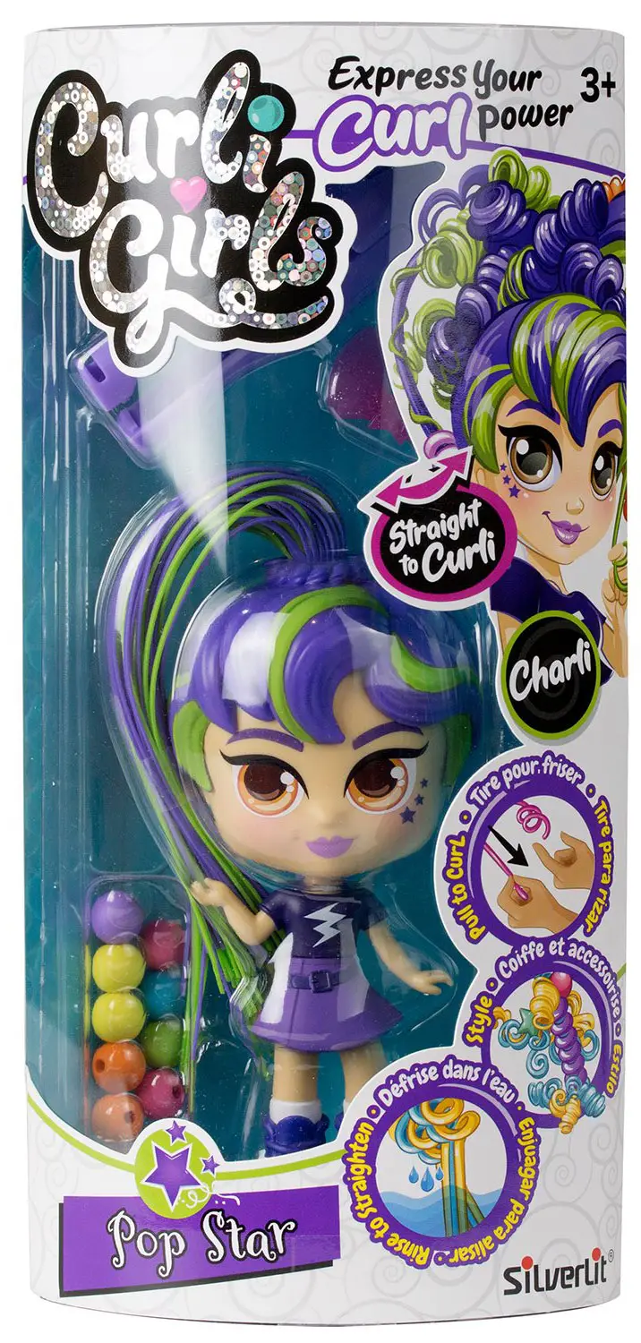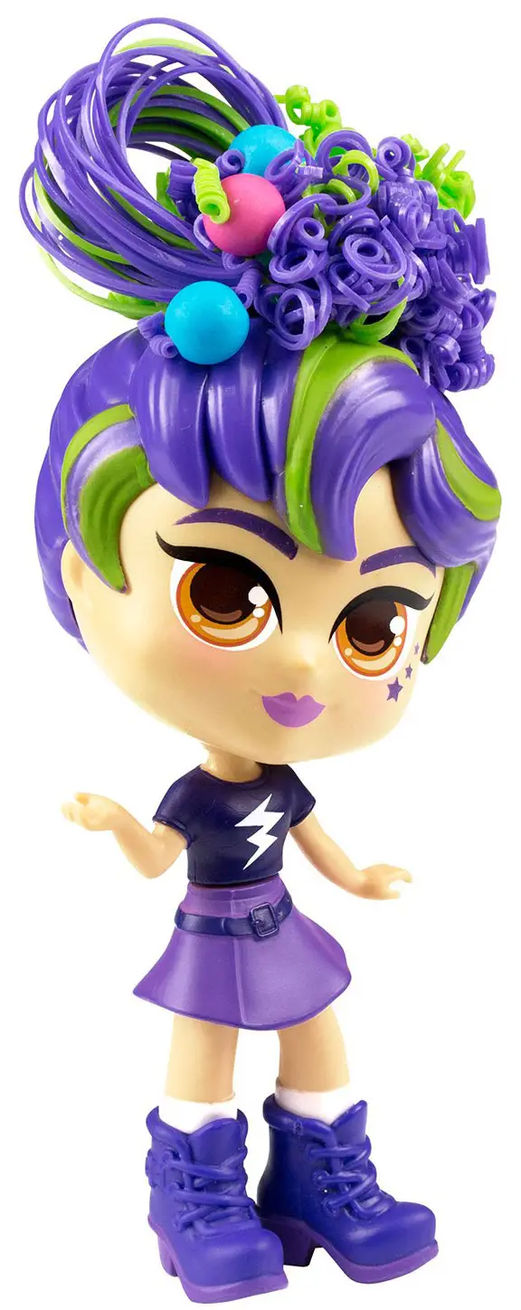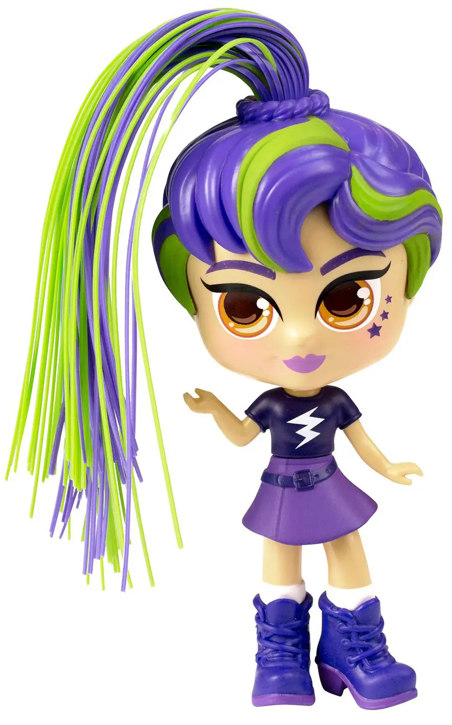 Очаровательная куколка поп-звезда Чарли с фиолетово-зелеными волосами в красивом платье готова сделать новые причёски.