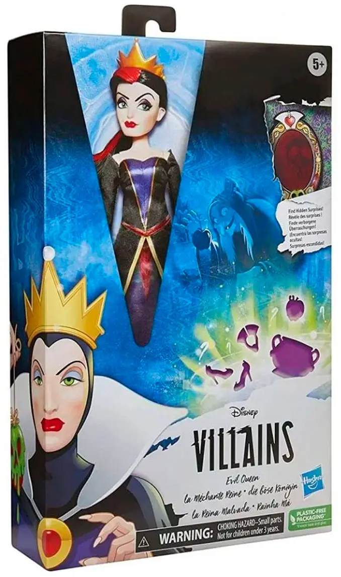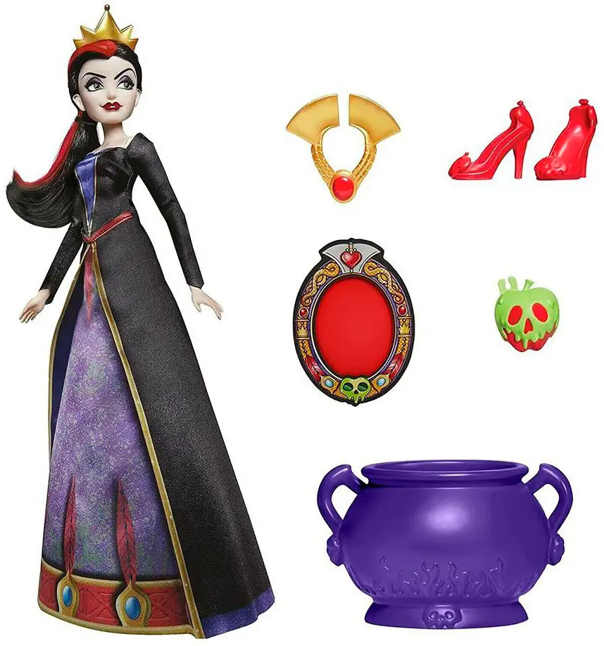 Королева – злая, жестокая и коварная мачеха Белоснежки, чья главная цель в жизни – быть самой прекрасной женщиной на свете. Кукла полностью соответствует образу королевы из мультфильма. В комплекте: кукла, платье, туфли, воротник-ожерелье, корона, котел, ядовитое яблоко и декодер, с помощью которого ребёнок сможет найти на упаковке секретные кармашки, в которых хранятся аксессуары.