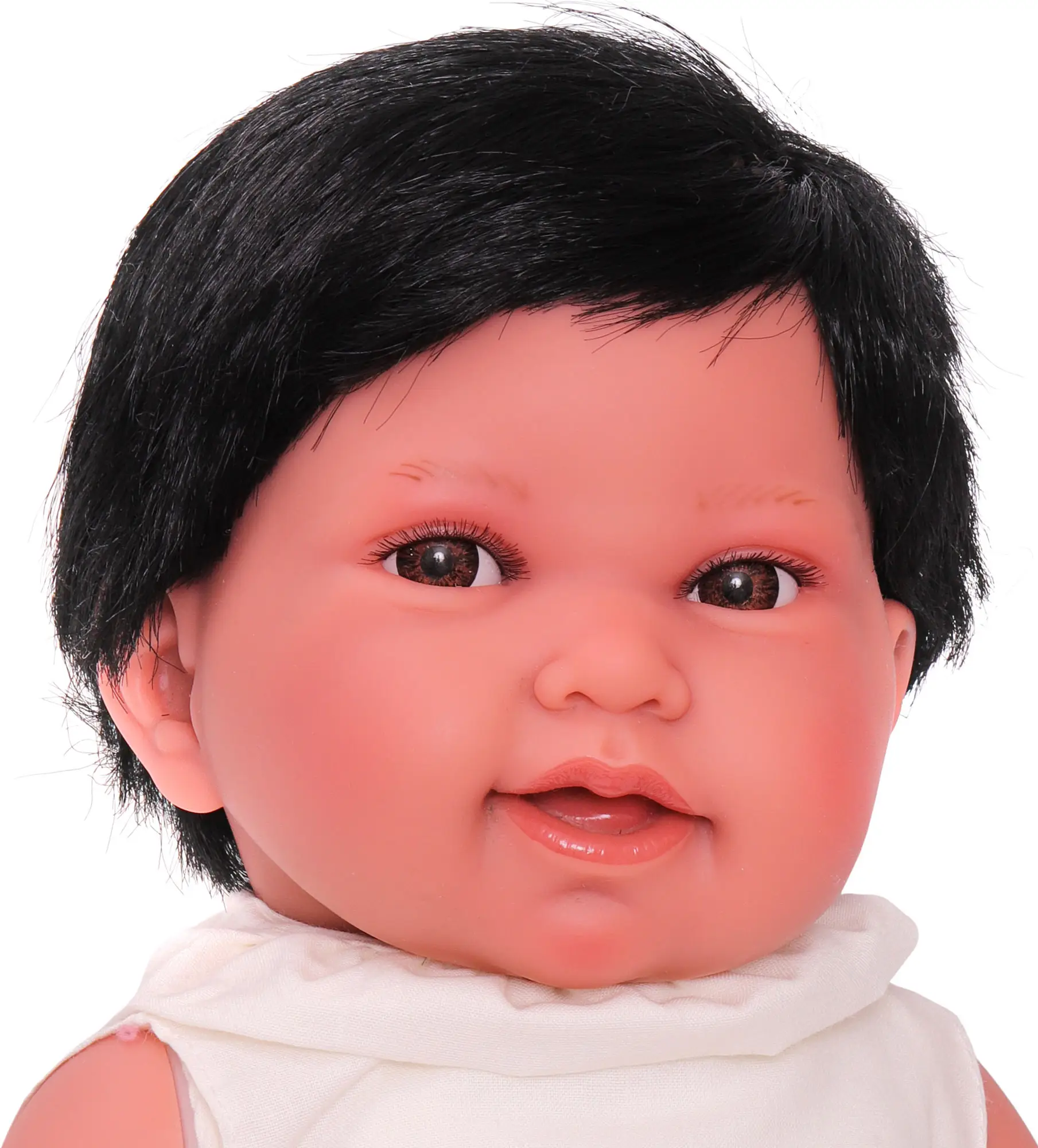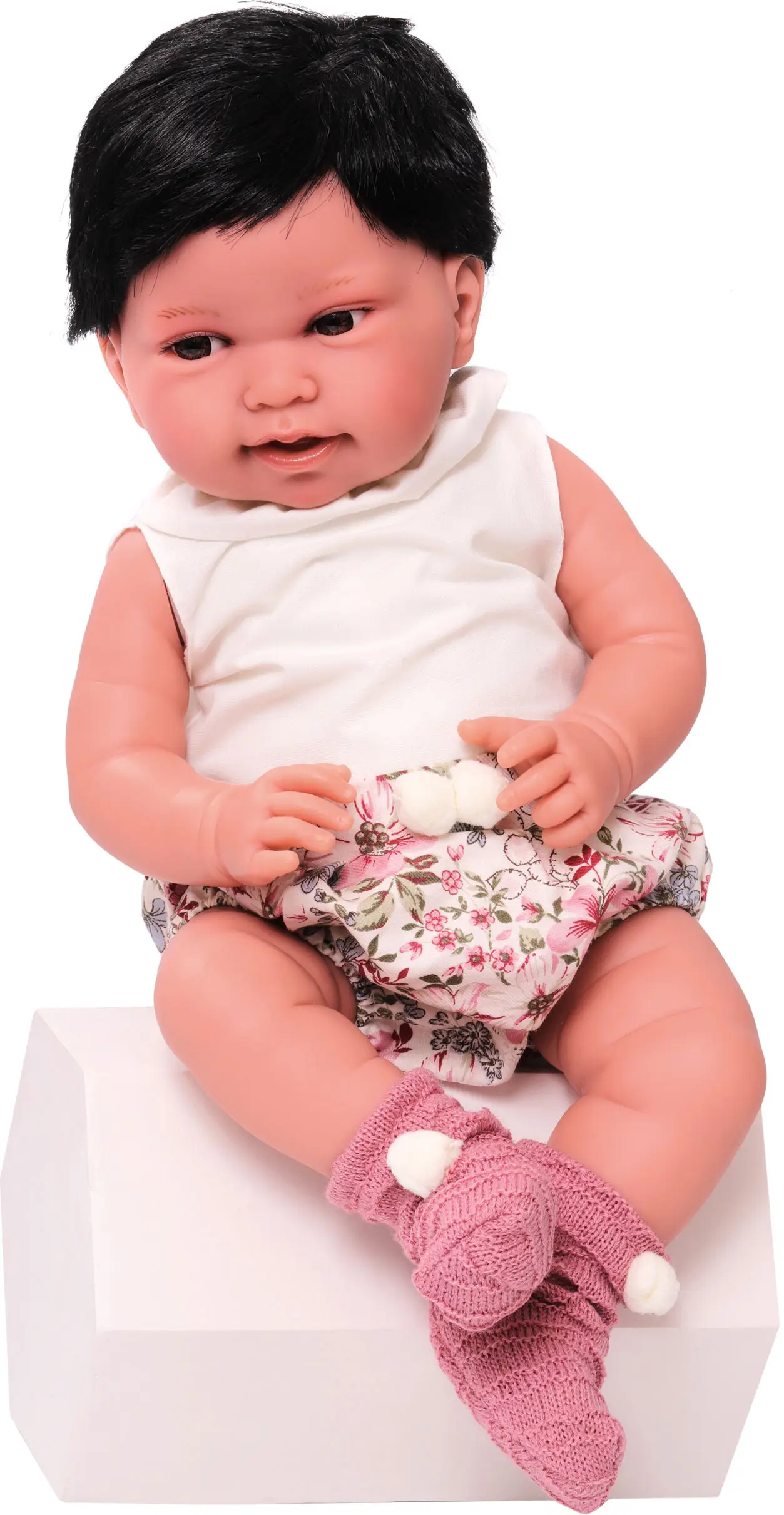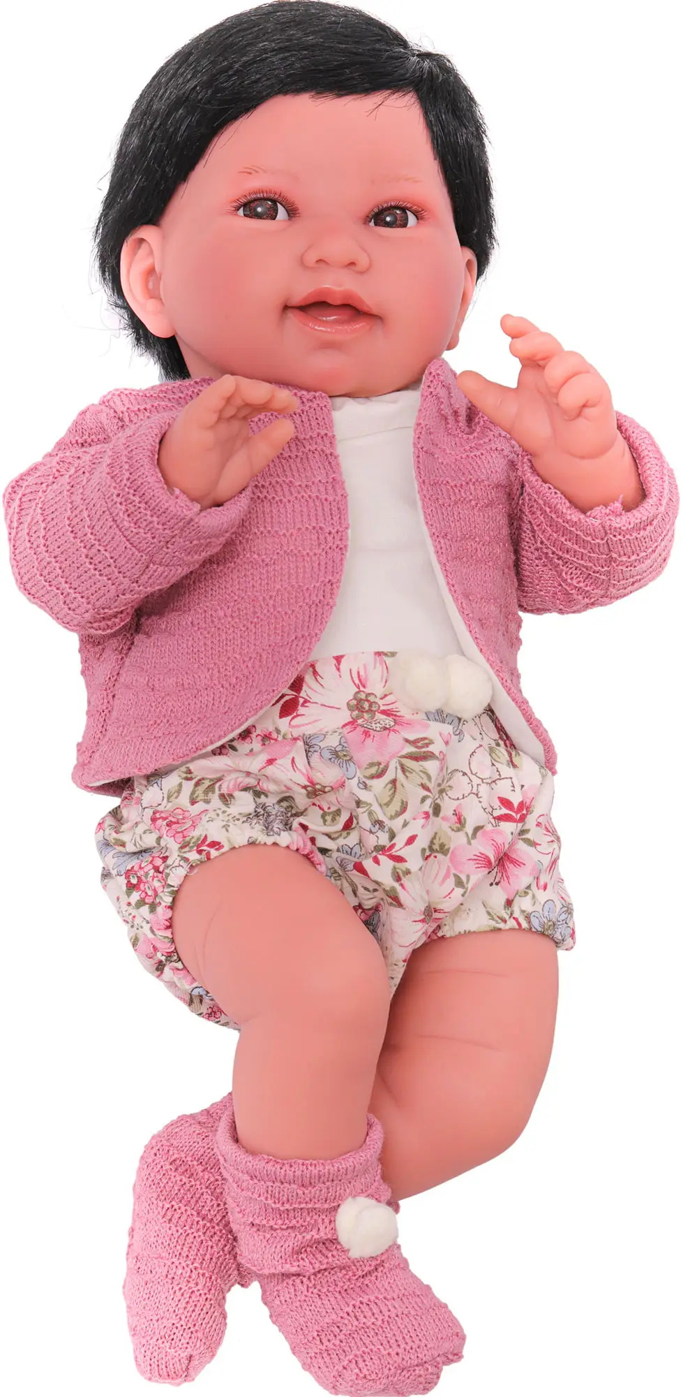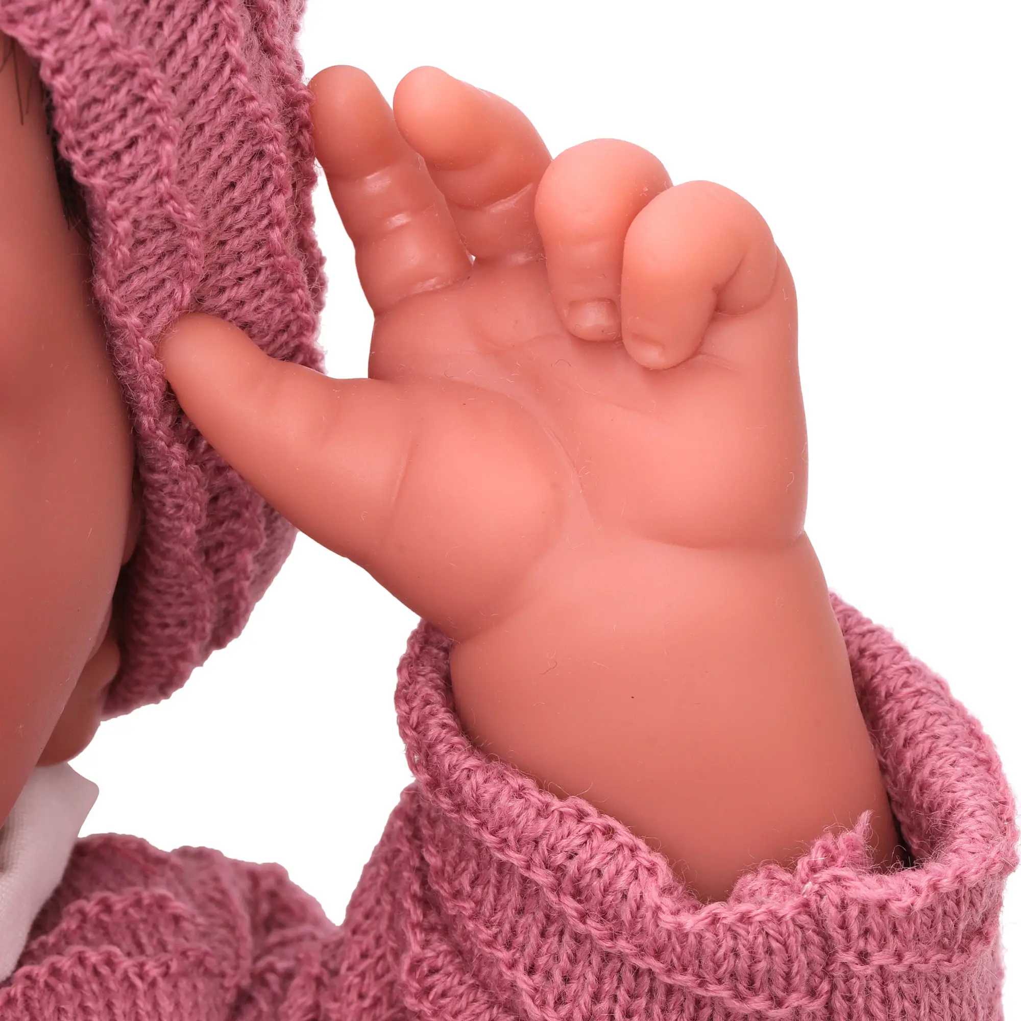 Тело куклы Сэнди от Antonio Juan мягконабивное, а голова, ручки и ножки изготовлены из гипоаллергенного винила с бархатистой поверхностью. У куклы карие глаза с длинными ресницами, которые искусно приклеены вручную.