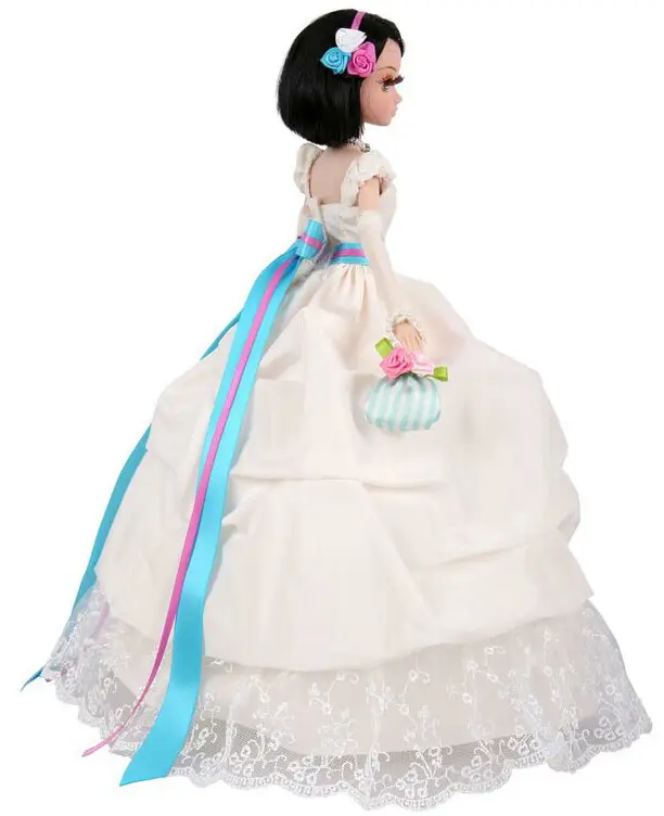 Одета в пышное белое платье с кружевом и бусинками. В руках куклы атласная сумочка, образ дополнен атласным поясом голубого цвета. Волосы к...