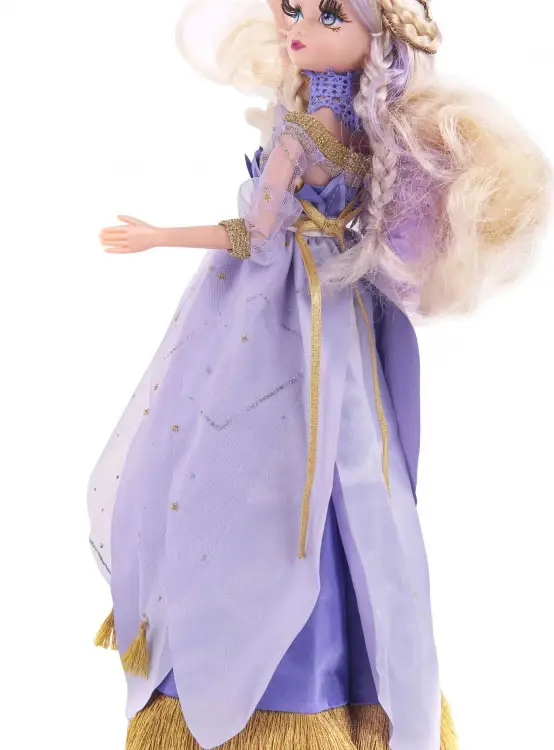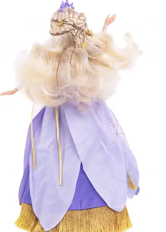 Наряд куклы Sonya Rose Фея цветов как будто соткан из цветов. И юбка, и лиф состоят из длинных переливающихся нежно-голубых лепестков. Низ юбки украшен длинной золотой бахромой. У платья модные в этом сезоне пышные рукава-фонарики. Верхний слой юбки мерцает серебряными и золотыми звездами, золотой пояс украшает "лунный" камень. Звёзды и полумесяцы украшают её волосы. На голове у Сони корона, а шею украшает голубой чокер. На её ножках белые колготки в сеточку и босоножки золотого цвета.