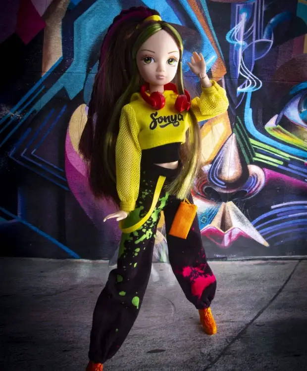 Кукла Sonya Rose в образе хип-хоп танцовщицы – прекрасный выбор для подвижных и стильных девчонок. Кукла одета в чёрные брюки с рисунком и жёлтую худи. Дополняют образ куклы яркие музыкальные наушники на шее, оранжевые ботинки и в тон им сумка кошелёк на поясе. Густые шелковистые тёмные волосы с яркими прядями впереди собраны в хвост. Изюминка куклы – шикарные шелковые ресницы. Шарнирная кукла Соня легко может сгибать руки и ноги, двигать головой и принимать различные танцевальные позы, а бонусом данной коллекции кукол являются дополнительные шарнирные кисти. С помощью таких кистей танцевальные возможности куклы шарнирной ещё шире и разнообразнее.