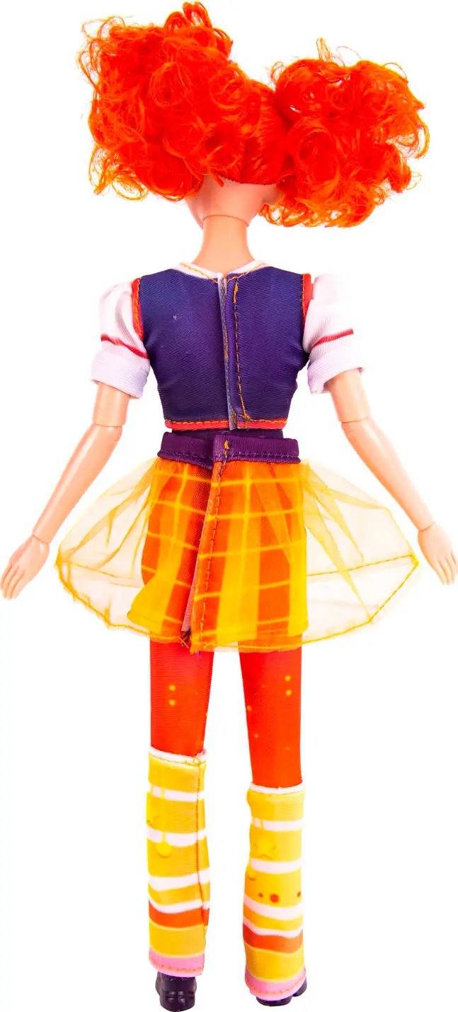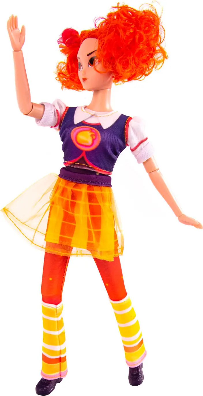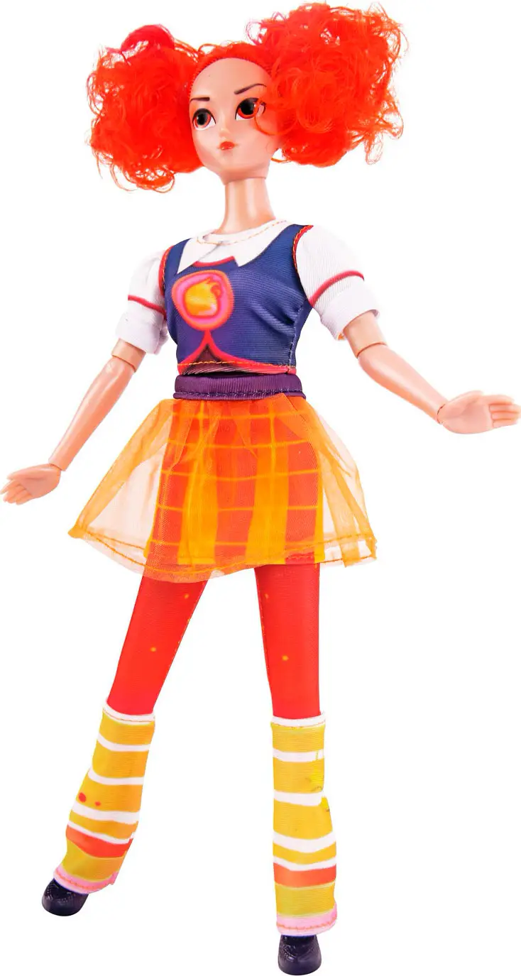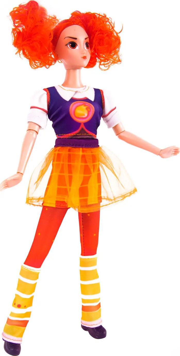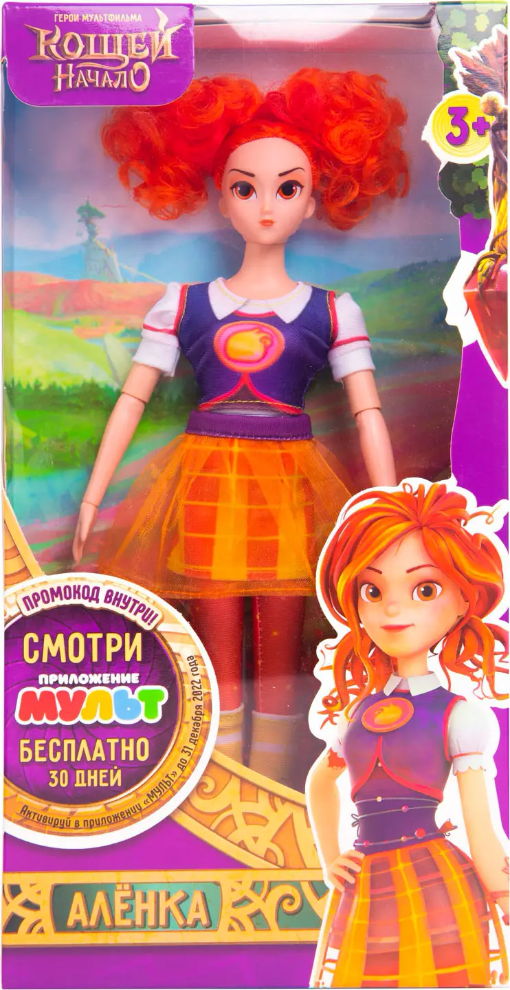 Кощей – захватывающая история увлекательных приключений молодого воина Кощея в волшебном мире. У Алёнки волосы собраны в два пышных рыжих хвостика. Она одета в эффектный костюм с прозрачной блестящей юбочкой поверх лосин. Одежда и обувь снимается. Высота куклы 28 см.