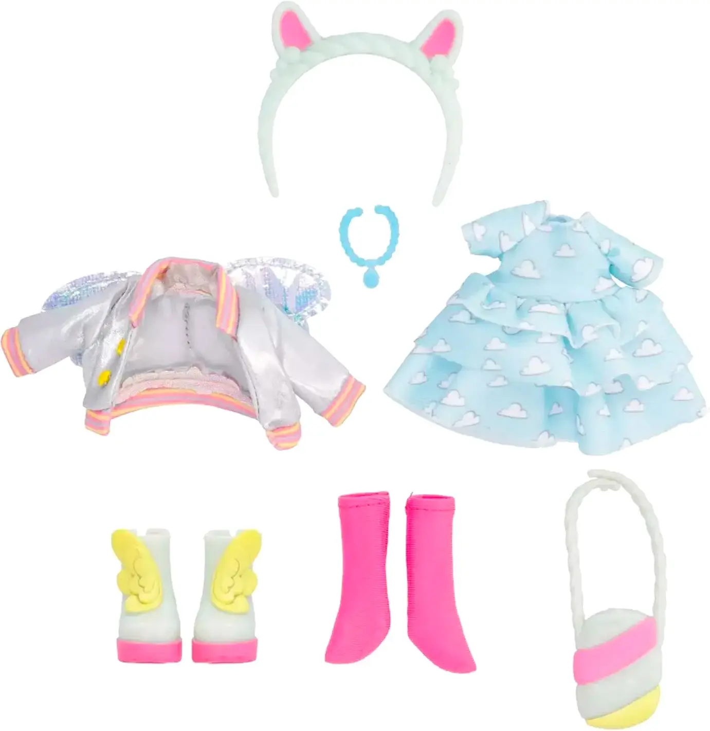 В набор входит нежно-голубое платье, серебристый бомбер с крылышками, розовые носочки, сапожки, сумочка, напоминающая конфетку, ожерелье и ободок с ушками.