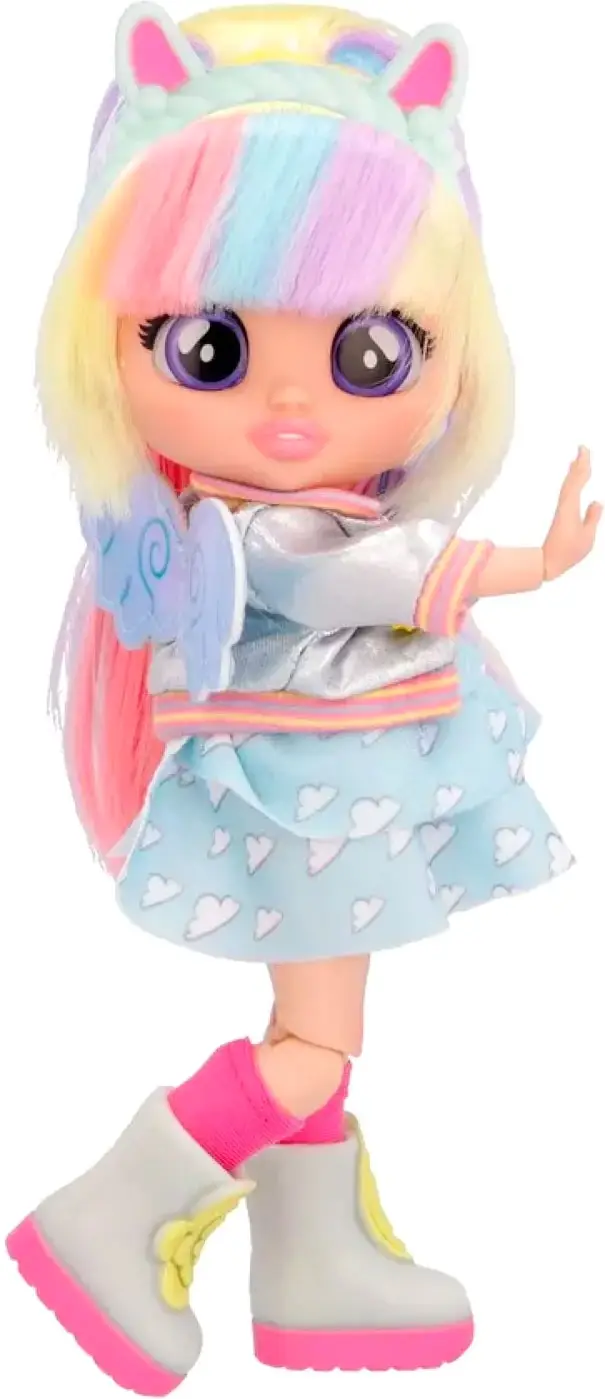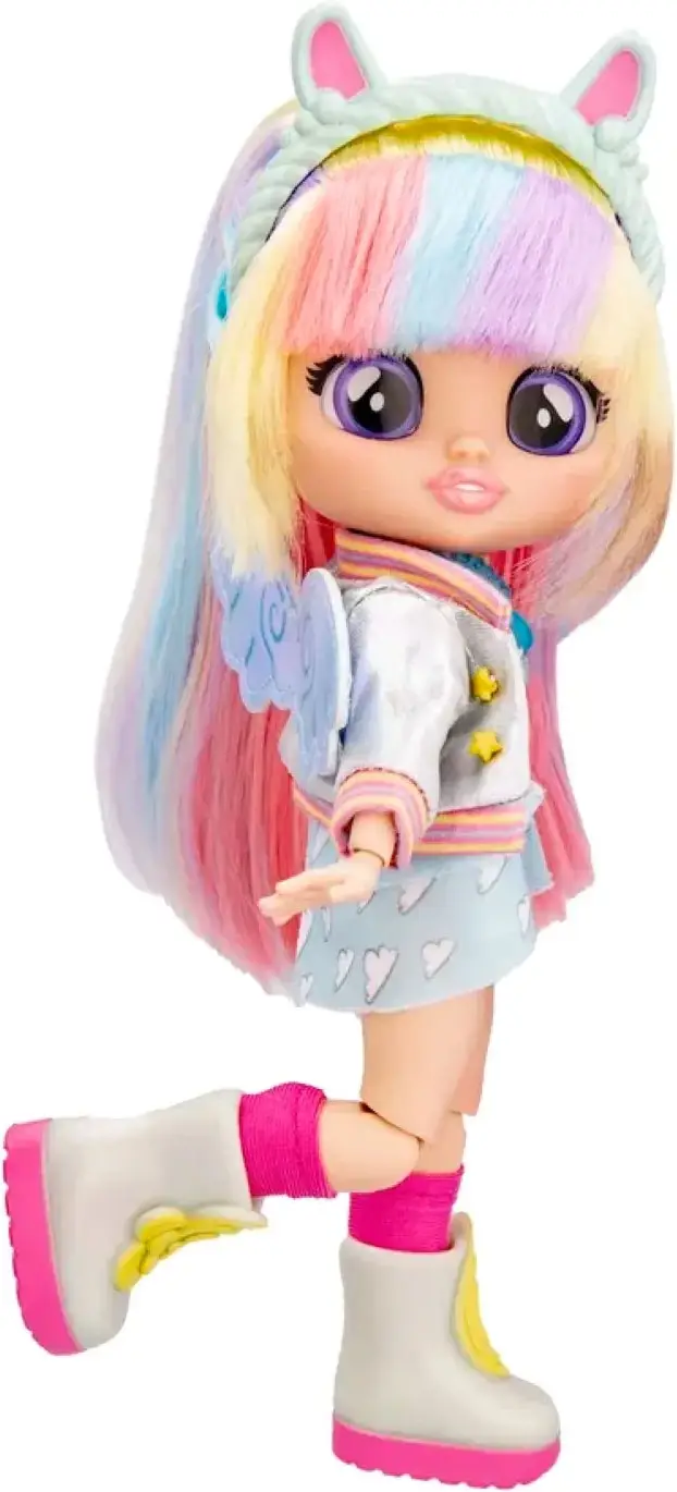 Кукла от бренда BFF изготовлена из высококачественного материала, безопасного для детей. У Дженны шелковистые разноцветные волосы и большие фиолетовые глаза. Она одета в модный наряд – платье в облачко, бомбер с крыльями, полусапоги и розовые носочки.