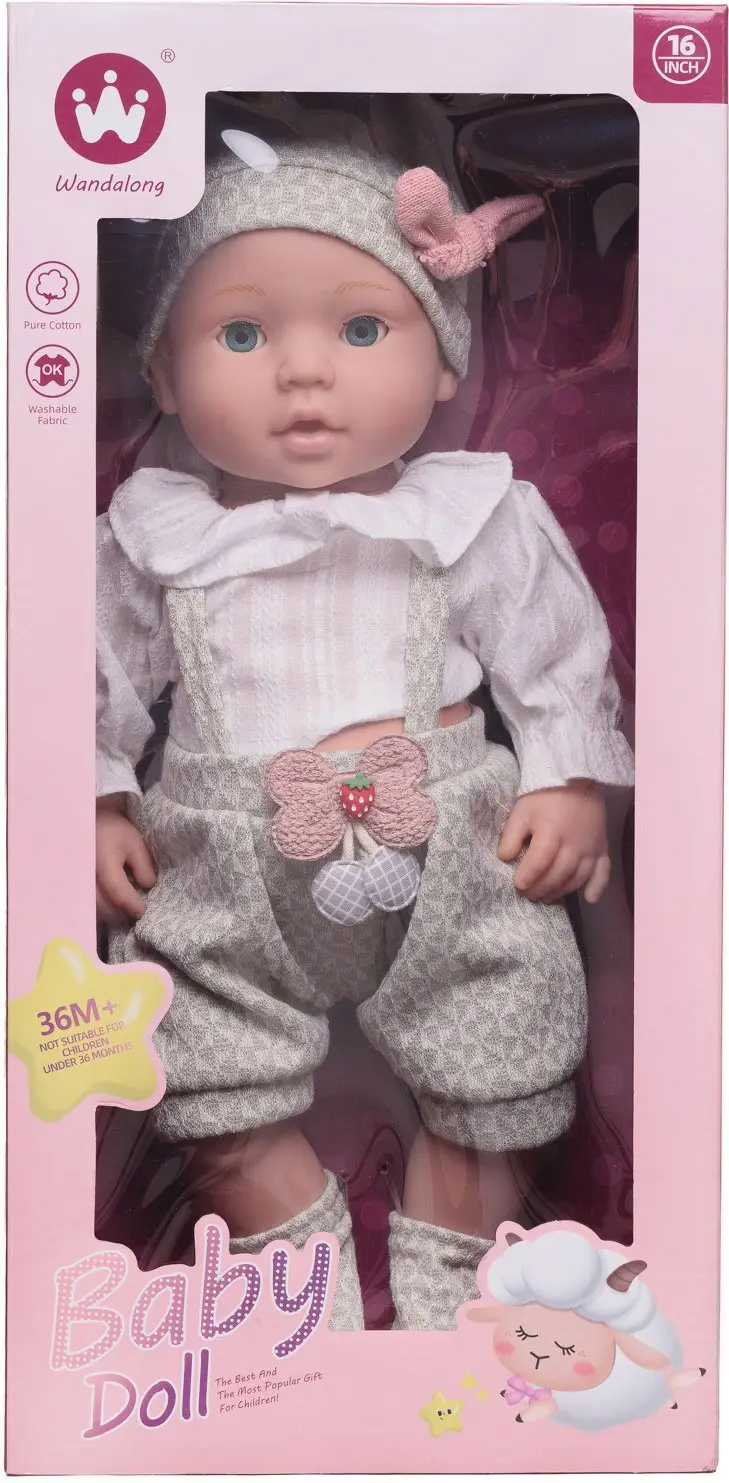 Пупс от бренда Junfa выполнен из безопасных и высококачественных материалов. Пупс выглядит реалистично, у него подвижные руки, ноги, голова, выразительные глазки. На игрушке одеты белая кофточка с рюшами вокруг шеи, серые штанишки с лямками, в тон им на голове – шапочка, на ногах – носочки.