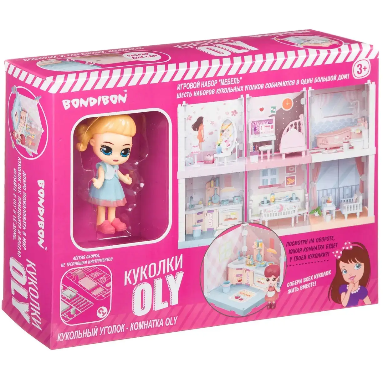 Игровой набор «Мебель» Bondibon прекрасно детализирован, имеет размер 13.5х13.5х13.5 см и куколку Oly размером 9,3 см. В каждом наборе "Кукольный уголок" своя уникальная куколка. А самое главное – все комнаты соединяются между собой, образуя целый домик. Соберите все комнаты и куколки OLY.
