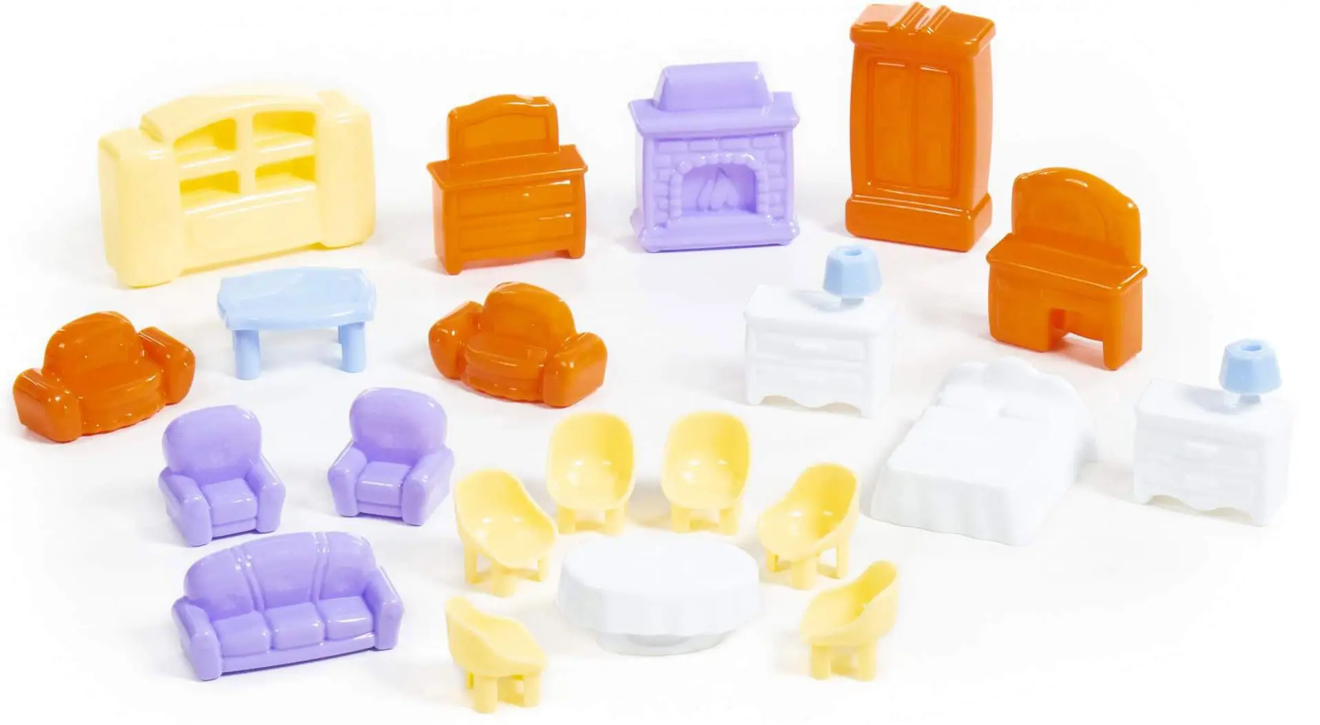 Набор мебели для кукол от Полесье будет идеальным дополнением, для игры и развития детей. Внесет уют в домики и даст возможность детям, создавать интерьер и обогатит детскую фантазию. В набор входит: кровать, 2 тумбочки со светильником, шкаф, туалетный столик, камин, комод, сервант, 2 софы, 2 кресла, стол, диван, 6 стульев и обеденный стол.