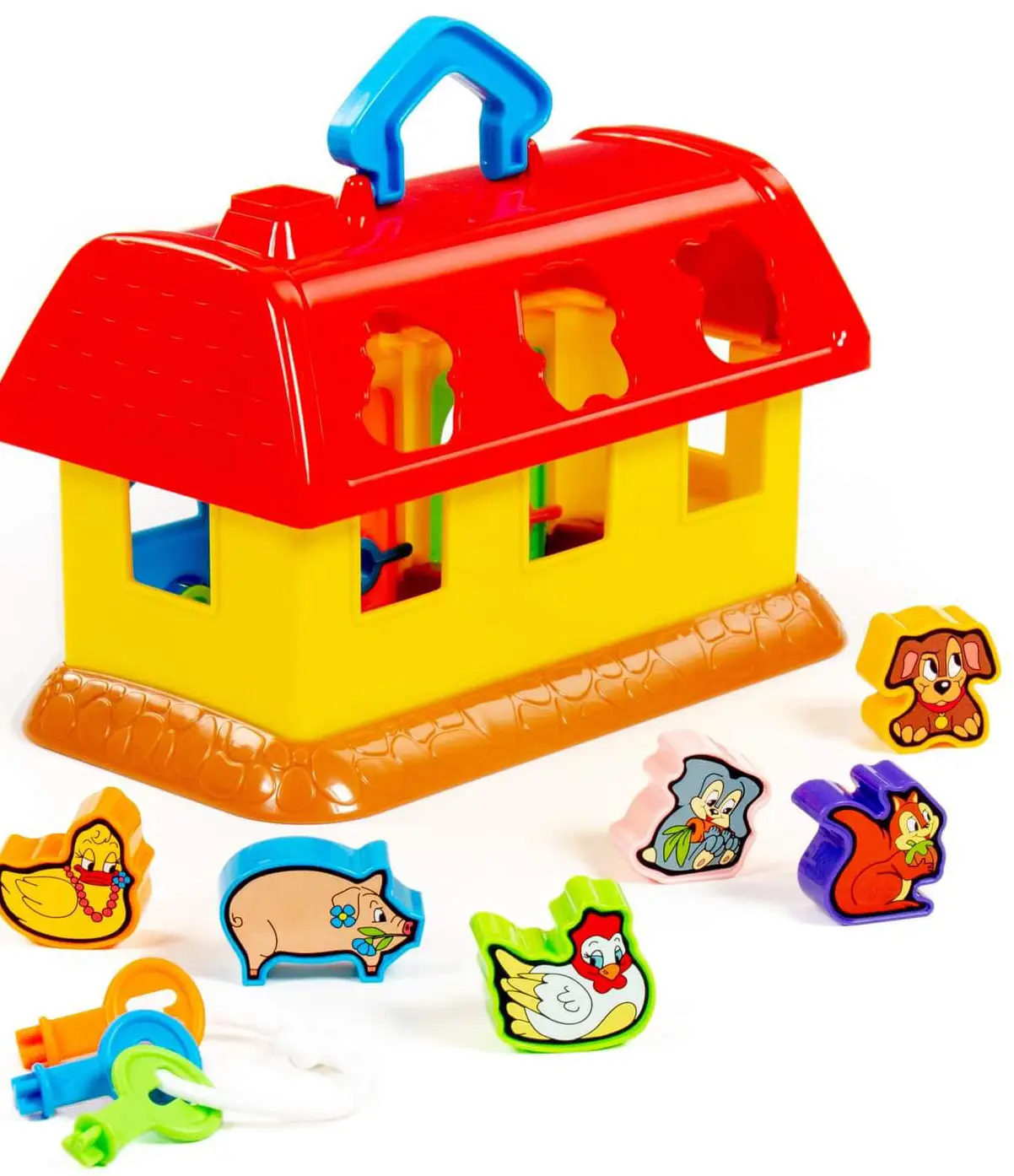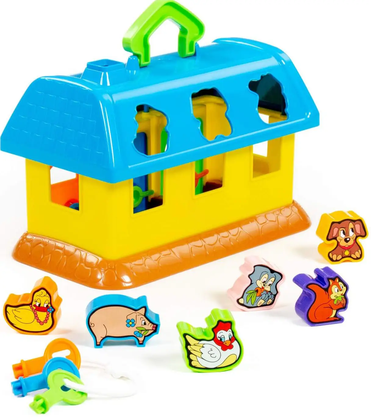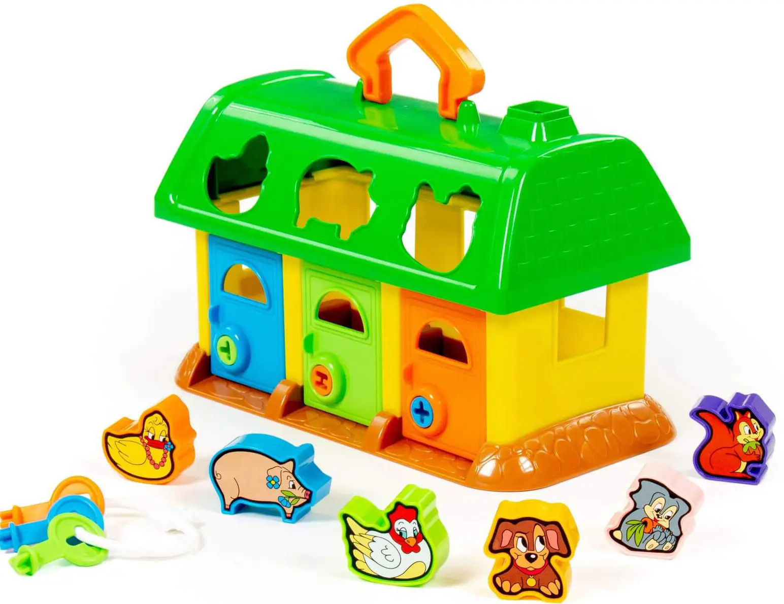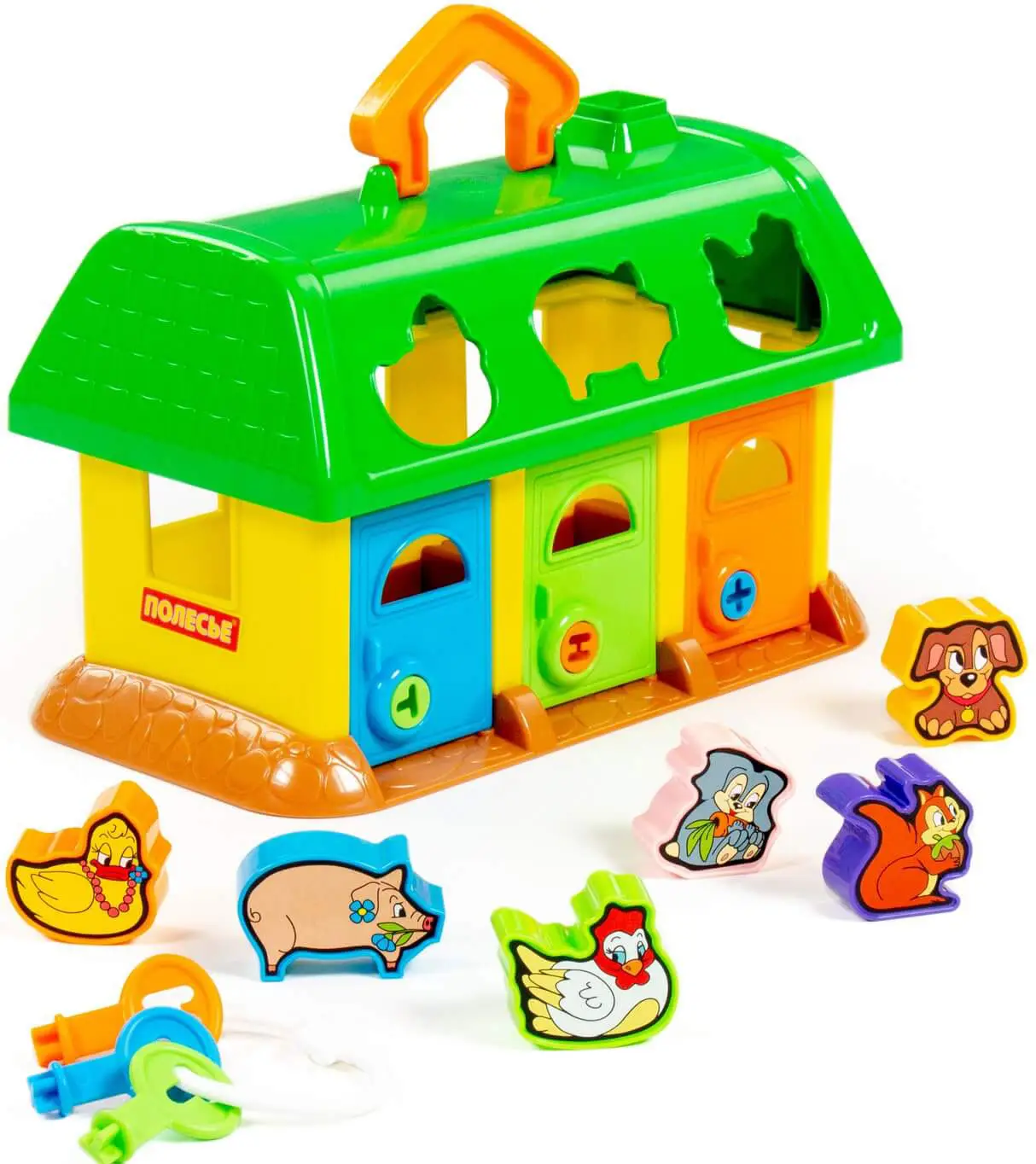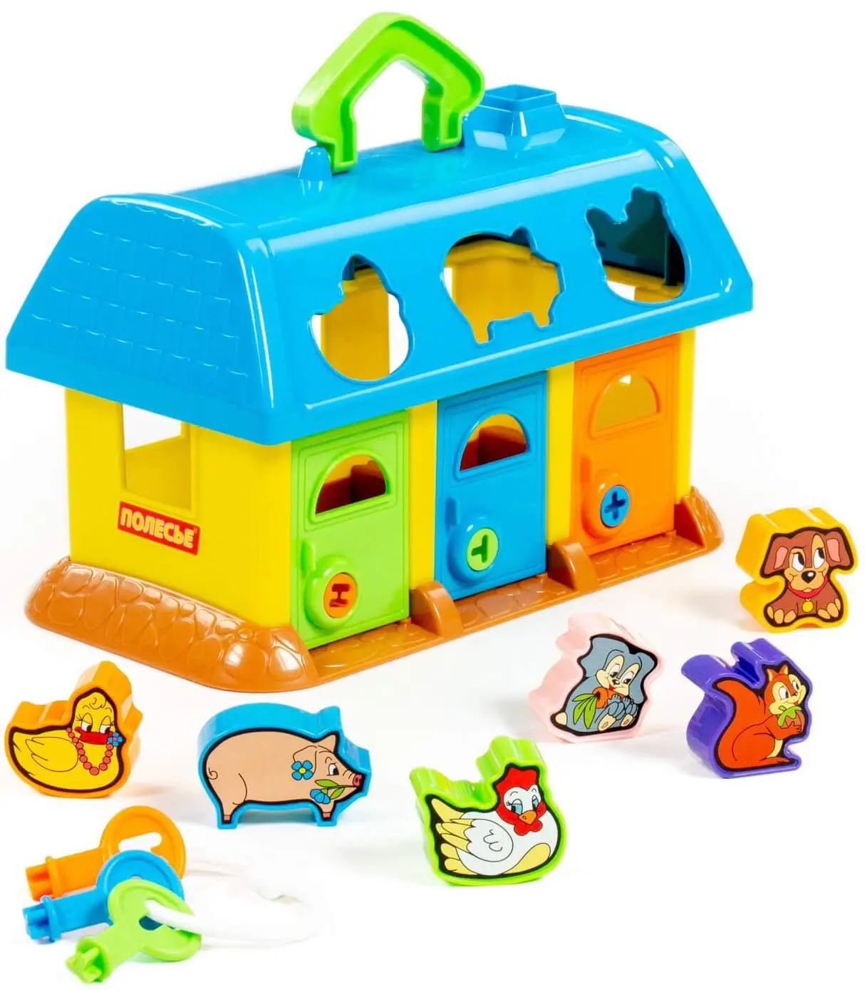 Развивающая игрушка в виде домика от Полесье изготовлена из безопасных материалов для здоровья ребёнка. На крыше домика 6 отверстий-пазлов в форме разных зверюшек, куда малыш подбирает и вкладывает соответствующие фигурки. У домика есть 3 дверки с замками, и чтобы открыть их и достать зверюшек, ребёнок подбирает ключики по цвету и форме замка.
