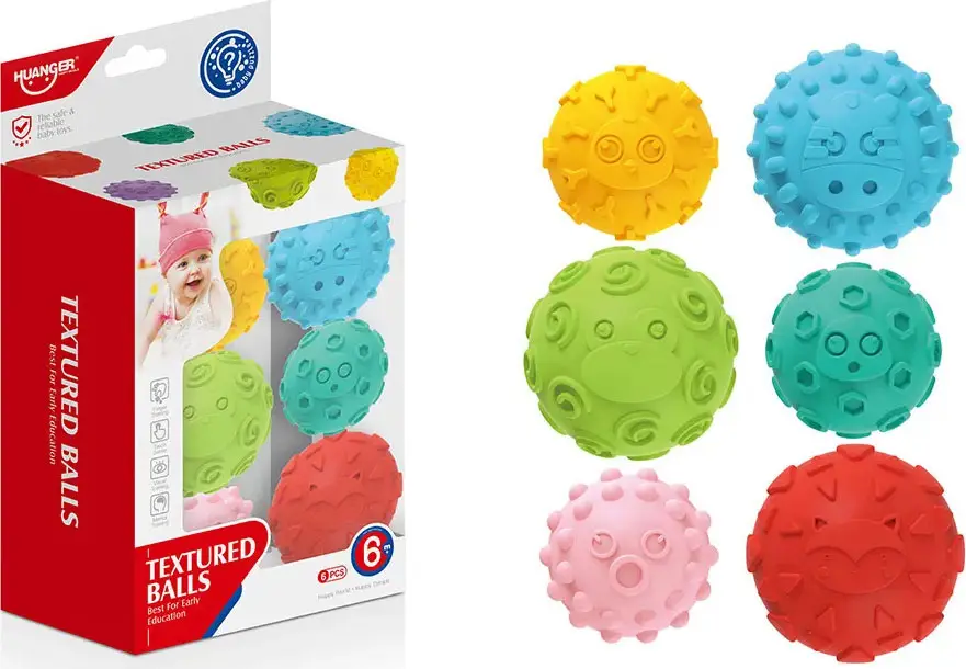 Игровой набор от Huanger стоит из 6 игрушек, выполненных в виде мячиков разной формы. Каждый мячик имеет разную текстуру и цвет, поэтому малыш с удовольствием будет их крутить в ручках и изучать. Игры с сенсорными игрушками помогают развитию моторики рук, внимания, координации и цветовосприятия.