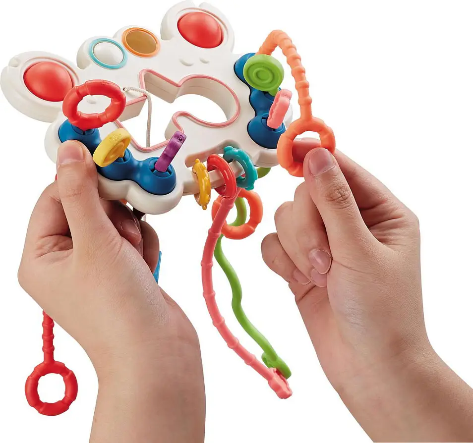 Резиночки – тянучки у этой тактильной погремушки имеют разную поверхность, приятную на ощупь, за счёт чего малыш ощущает разнообразную вибрацию, когда перетягивает рельефные силиконовые шнурочки с одной стороны планшета на другую, а это способствует укреплению мышечного тонуса пальчиков вашего крохи и развивает мелкую моторику.