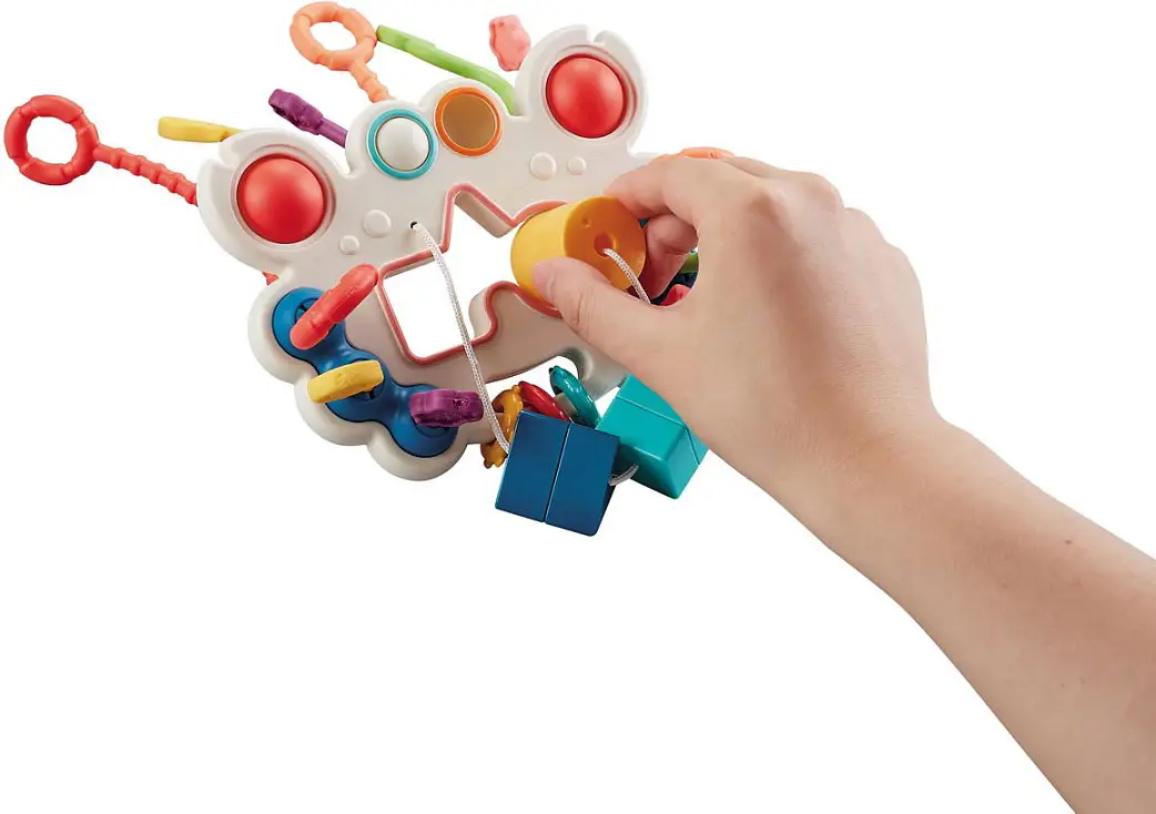 Ребёнку будет интересно перемещать скользящую кнопочку из одного отверстия в другое, перебирать колечки, тренировать гибкость пальчиков при помощи лопающихся пузырей. Погремушки геометрической формы, нанизанные на верёвочку, как бусины, можно вставлять в специальные отверстия, развивая когнитивные способности.