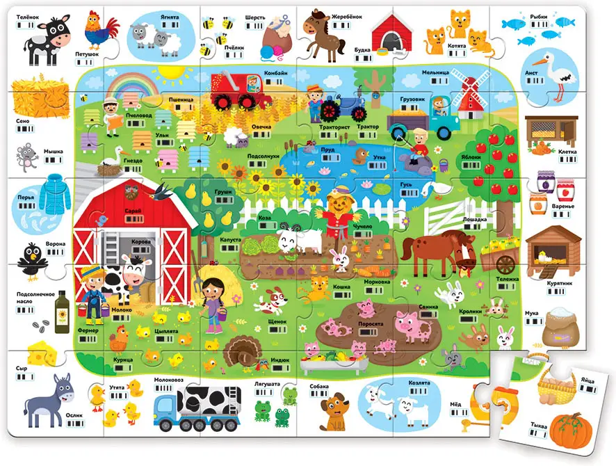 В игровом наборе "Ферма Первые знания" ребенок найдет говорящего робота со сканером штрихкодов и пазл из 30 элементов.