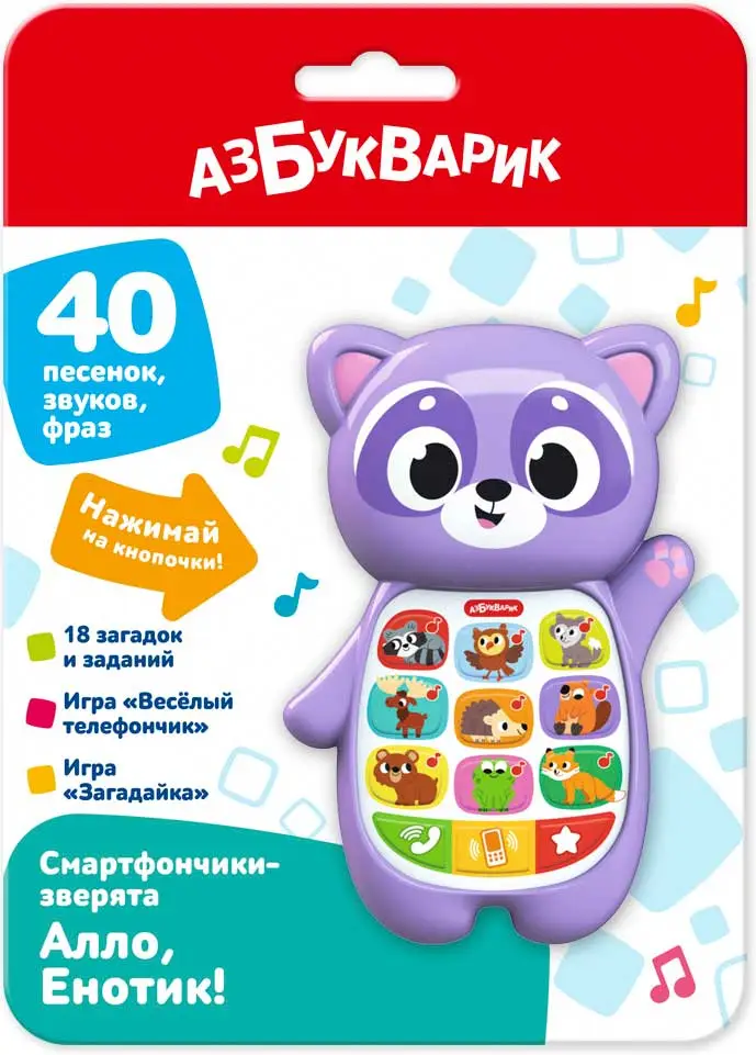 Необычный музыкальный смартфончик для малыша – в виде забавного Енотика! Нажимая на кнопочки-иконки, ребенок послушает песенки про лесных зверят, модные рингтоны и сможет поиграть в две увлекательные игры: Игра "Весёлый телефончик" – малыш сможет звонить Енотику и его друзьям, и зверюшки ответят ему. Игра "Загадайка" – ребенок будет отгадывать загадки и угадывать голоса зверят.