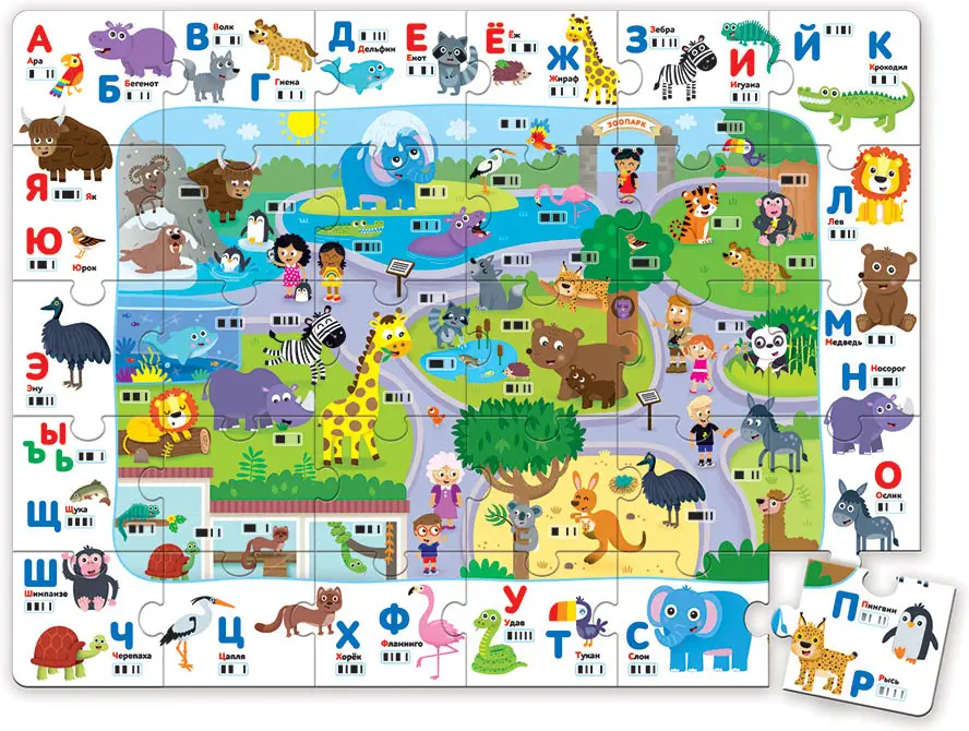 Перед началом игры ребенку нужно самостоятельно собрать большое игровое поле-пазл. Затем можно учить буквы и знакомиться с животными зоопа...