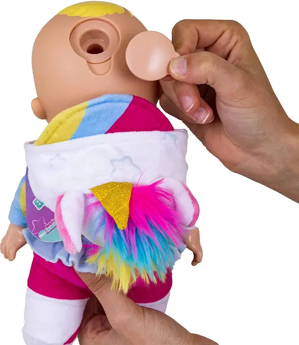 - плачет слезами, состоящими из воды (необходимо залить воду в специальный отсек на голове куклы согласно инструкции).