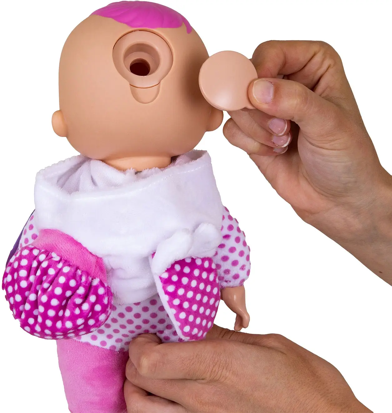 - плачет слезами, состоящими из воды (необходимо залить воду в специальный отсек на голове куклы согласно инструкции).