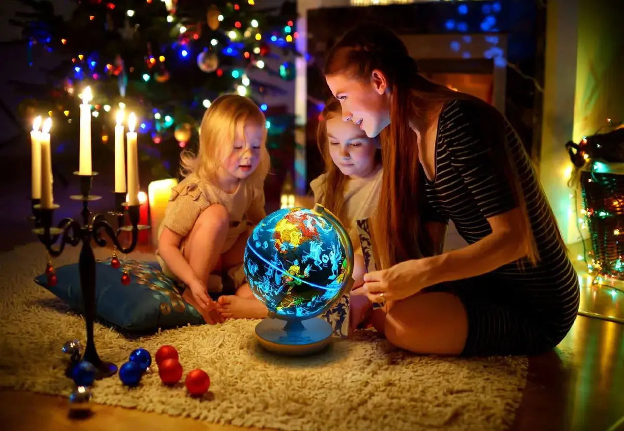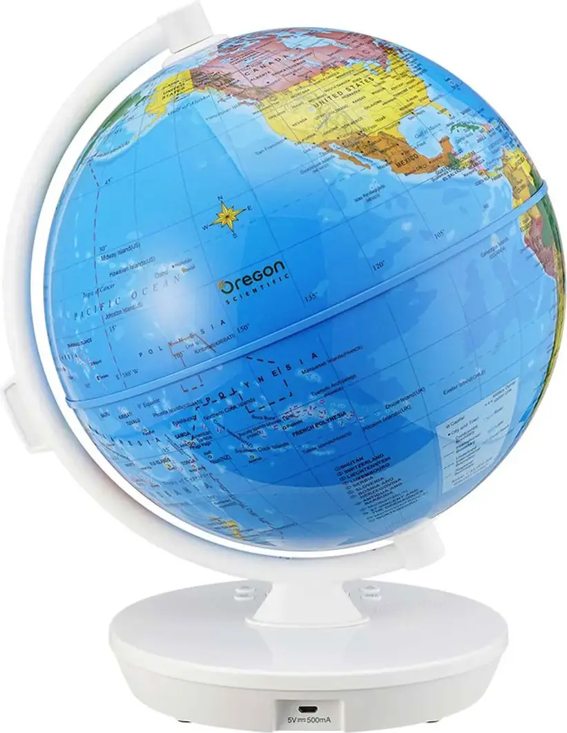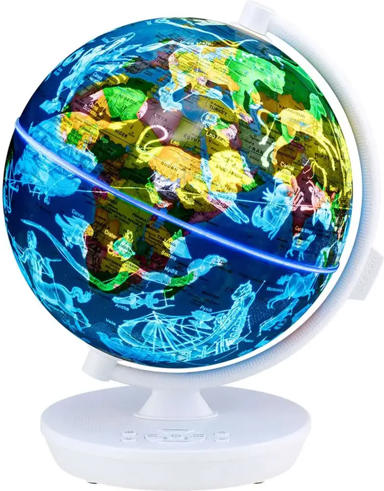 Интерактивный глобус-ночник от Oregon Scientific воспроизводит любимые сказки, интересные факты о планете, а также легенды о зодиакальных созвездиях. Устройство поддерживает дополненную 3D-реальность. Для этого достаточно загрузить на смартфон мобильное приложение. При наведении телефона на интерактивный глобус-ночник на экран выводится изображение животных, достопримечательностей, динозавров, кухни народов мира, аттракционов, флагов, исторических событий и знаменитостей в 3D-формате.
