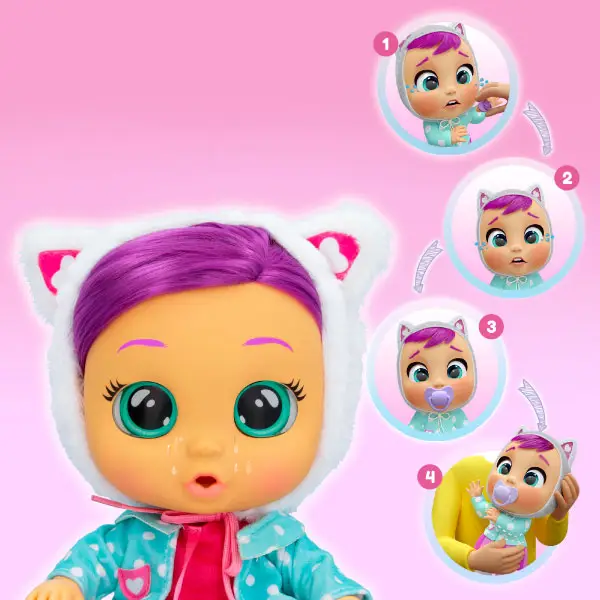 - плачет слезами, состоящими из воды (необходимо залить воду в специальный отсек на голове куклы согласно инструкции).