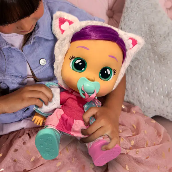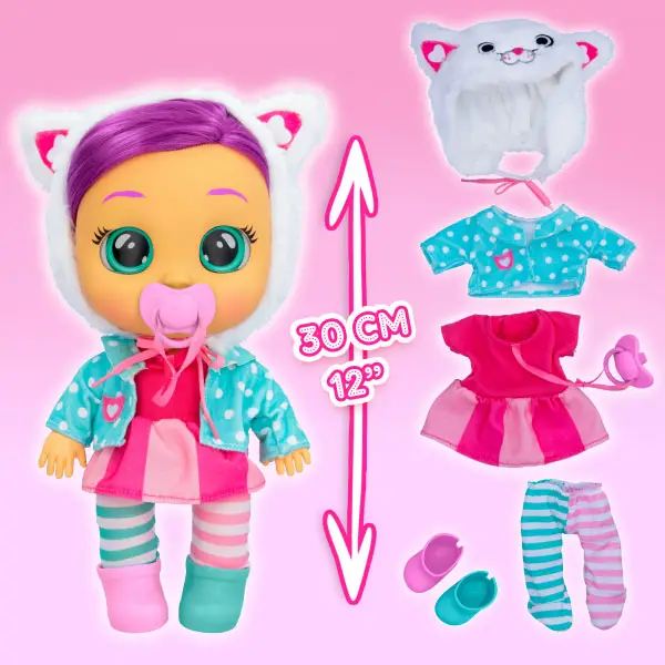 Модница Дейзи нуждается в твоей заботе! Она обожает, когда с ней играют, одевают, а ещё больше, когда обнимают. Но не стоит расстраивать обворожительную малышку! Она начнёт грустно всхлипывать и плакать настоящими слезами, если ты заберешь у неё пустышку. Нужно успокоить милую Дейзи! Обними и положи её на спинку или дай пустышку: и Модница Дейзи снова станет счастливой! Смеяться и плакать – это не все, что она умеет: Дейзи будет реагировать различными звуками на твои действия. Дейзи обожает петь, и у неё это отлично получается! Дома она устраивает репетиции на своей импровизированной сцене. Ей нравится петь и для других, поэтому она часто устраивает концерты для своих подружек Край Бебис. У очаровательной Дейзи модный съемный наряд кошечки и стильная обувь. Она любит двигать ручками, ножками и головой. Поиграй с Дейзи и окунись в мир Волшебных Слез!