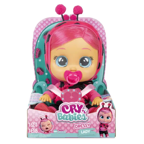 Модница Леди нуждается в твоей заботе! Она обожает, когда с ней играют, одевают, а ещё больше, когда обнимают. Но не стоит расстраивать обворожительную малышку! Она начнёт грустно всхлипывать и плакать настоящими слезами, если ты заберёшь у неё пустышку. Нужно успокоить милую Леди! Обними и положи её на спинку или дай пустышку: и Модница Леди снова станёт счастливой! Смеяться и плакать – это не всё, что она умеет: Леди будет реагировать различными звуками на твои действия. Несмотря на то, что Леди очень спокойная и расслабленная, она всегда уверенна в себе. Она легко может помирить своих подружек Край Бебис. В свободное время она любит ухаживать за собой и фотографироваться. У очаровательной Леди модный съемный наряд божьей коровки и стильная обувь. Она любит двигать ручками, ножками и головой. Поиграй с Леди и окунись в мир Волшебных Слез!
