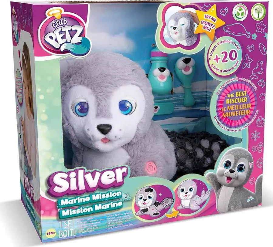 Сильвер IMC Toys интерактивный плюшевый детеныш тюленя, абсолютно очаровательного и беззащитный. Он нуждается в вашей помощи и заботе. Необходимо спасти его и залечить его рану пластырем, очистить масляные пятна, освободить его хвост, завернутый в пластиковую сетку, и дать ему лекарство.
