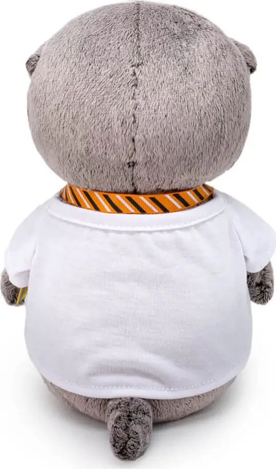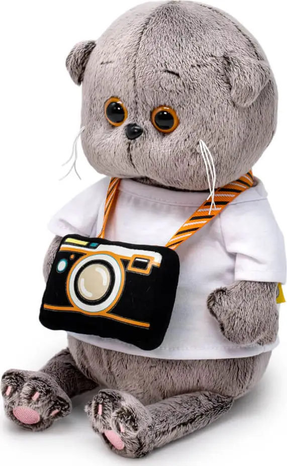 Малыш Басик как настоящий фотограф с объёмным фотоаппаратом на стильном ремешке в полоску. Также на Басике беленькая футболочка из х/б трикотажа.Симпатичный малыш с мягкой и шелковистой шёрсткой, приятной на ощупь, не оставит равнодушным ни ребёнка, ни взрослого.