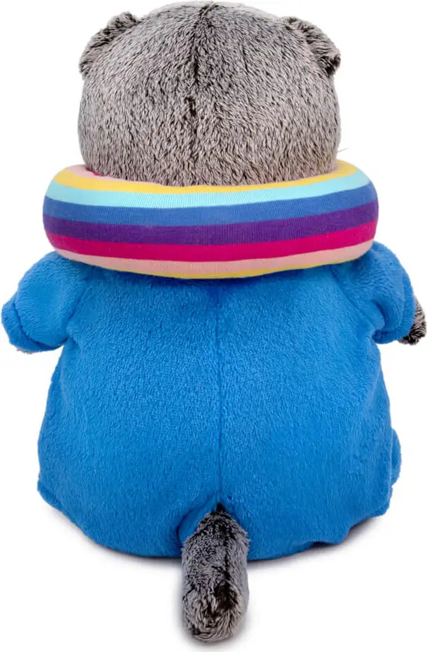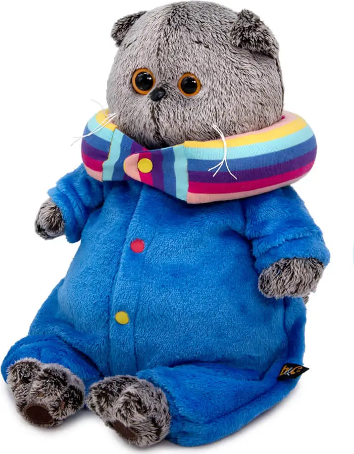 Малыш Басик в модном комбинезоне из ворсистого софта лазурного синего цвета. Спереди комбинезон застёгивается на разноцветные кнопки. На шее у кота яркая дорожная подушка в полоску, с застёжкой на лимонную кнопку. Симпатичный малыш с мягкой и шелковистой шёрсткой, приятной на ощупь, не оставит равнодушным ни ребёнка, ни взрослого.