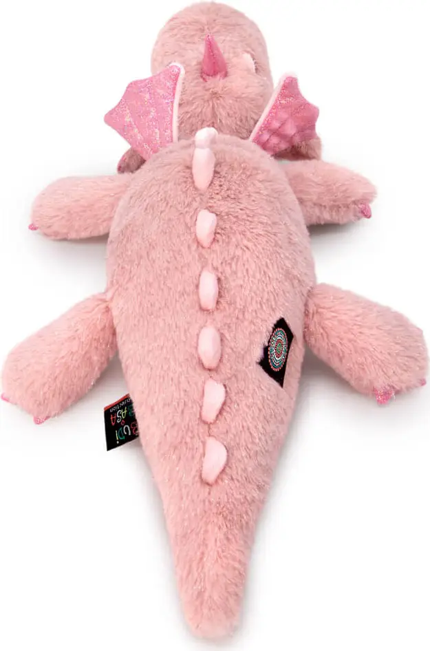 Лежачий дракончик Уни из розового меха с серебристым блеском, с розовыми блестящими вставками, а также нежно‑розового софта.