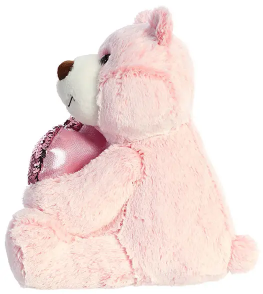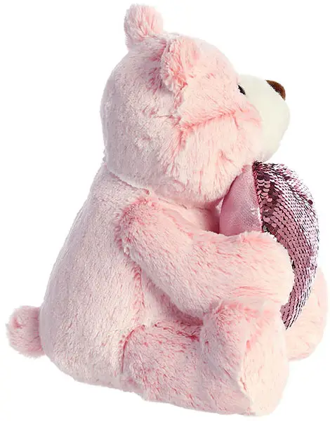 Игрушка в сидячей позе, держит в лапах большое сердечко в блестящих пайетках. Если провести рукой против направления пайеток, они изменяют ц...
