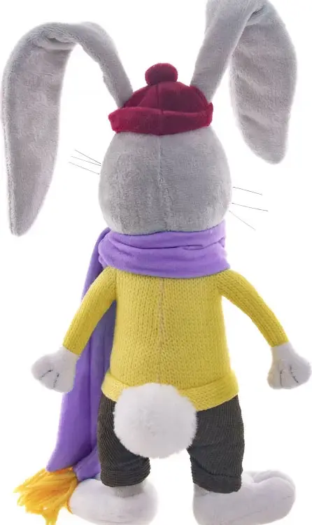 Зайка-стиляга от Gulliver одет в вязаный свитер с пуговками, бархатные штанишки, длинный шарф и модную шапочку. Все мелкие детали мордочки...