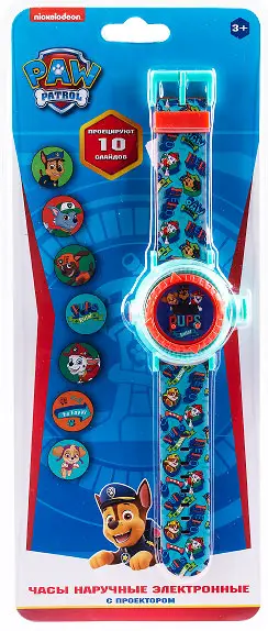 Электронные часы в стиле Щенячий патруль понравятся любому мальчику. У часов стильный дизайн яркого-голубого цвета с множеством интересных деталей на браслете, а также два функционала – часы + развивающая игрушка. Аксессуар-проектор, имеет возможность проецировать 10 слайдов.