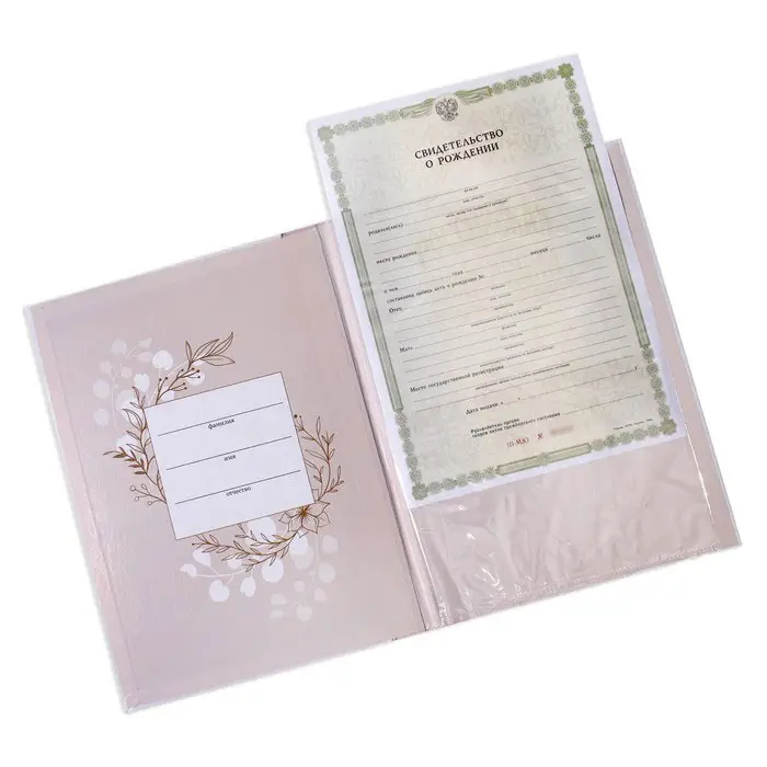 Обложка для свидетельства о рождении А4 – полезный аксессуар, позволяющий хранить первый важный документ ребёнка в целости и сохранности. Материал обложки выполнен из плотного переплётного картона 1,25 мм, приятен на ощупь. Внутри – плотный файл размером А4. В такой обложке документ сохранится и не помнётся даже при активном использовании.