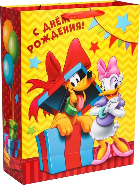 Яркий подарочный пакет с главными геориям мультфильма "Микки Маус",